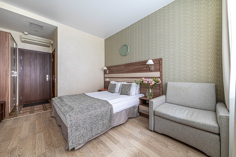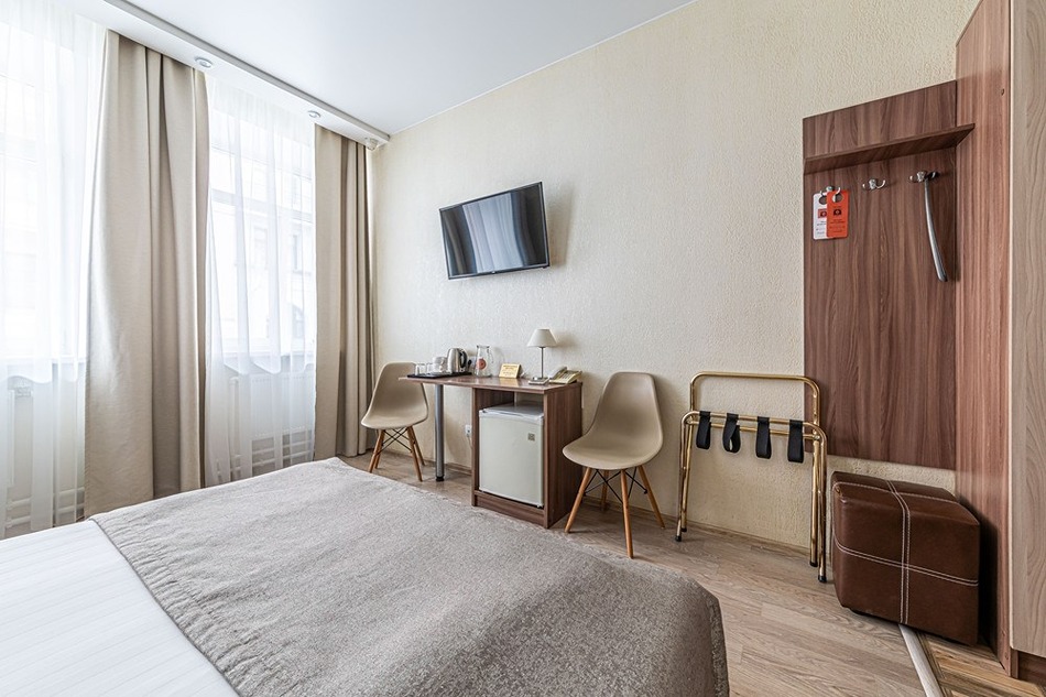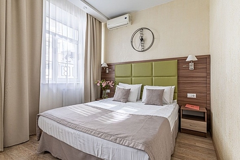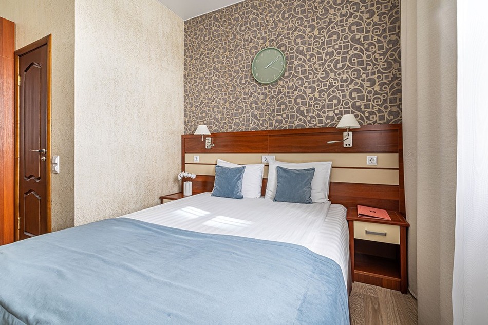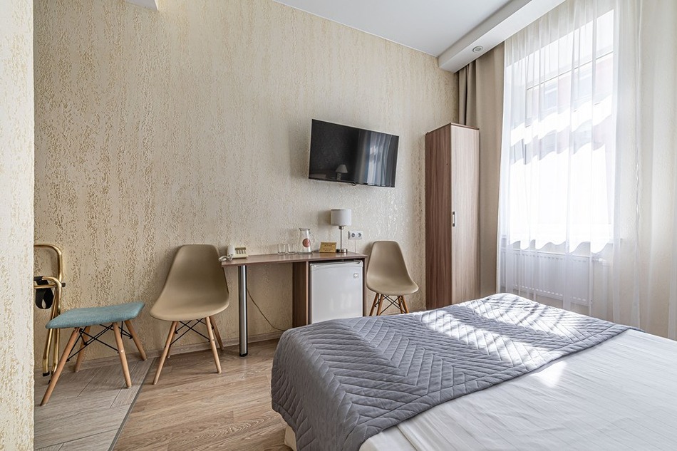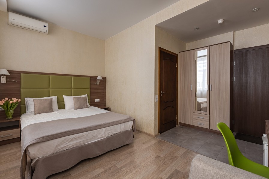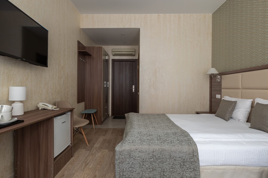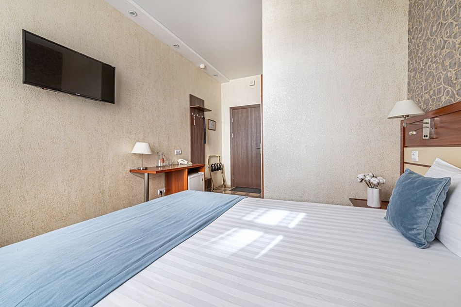 В номере: вешалка, зеркало, кровать двуспальная, прикроватные тумбочки, стол, стулья, шкаф, кондиционер, мини-холодильник, сейф, телевизор, телефон