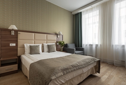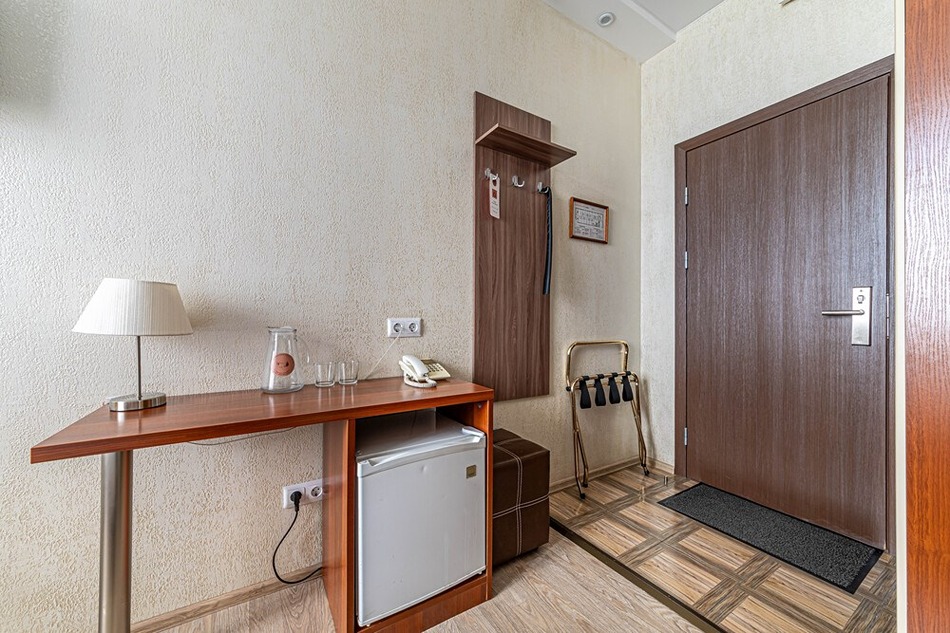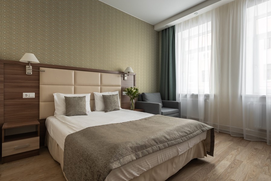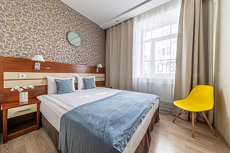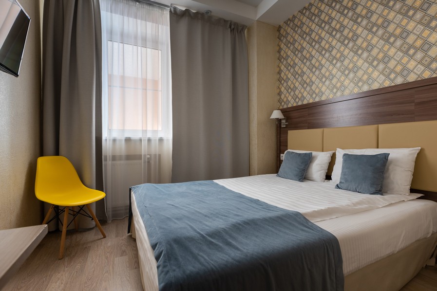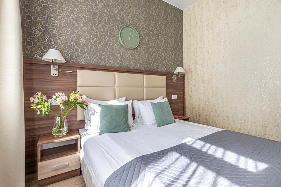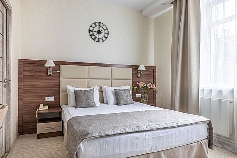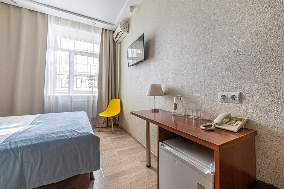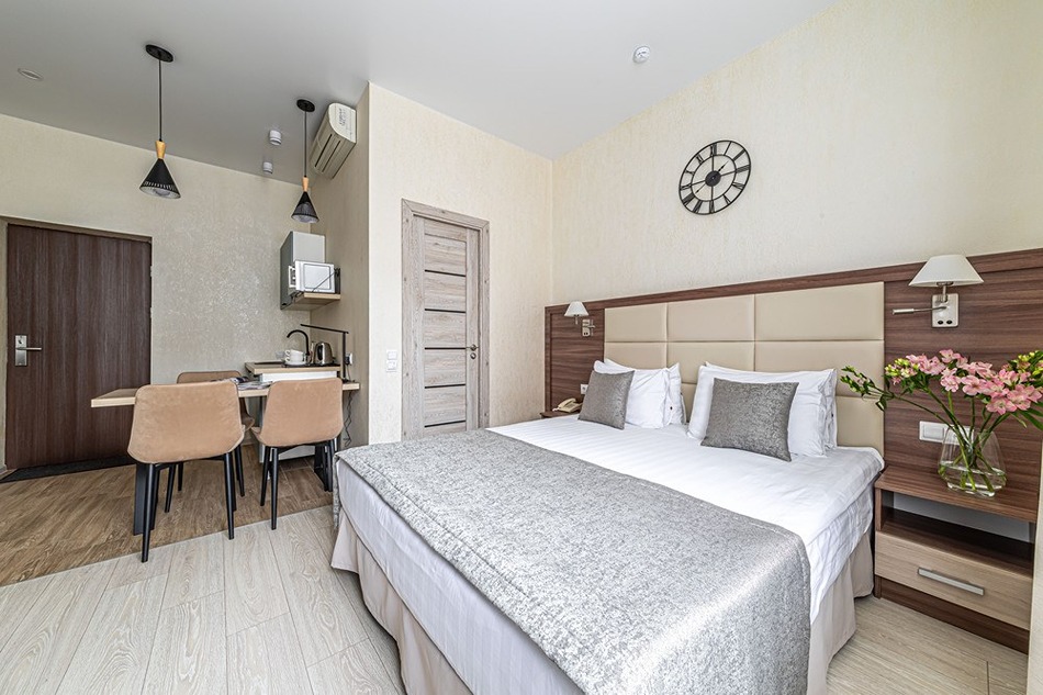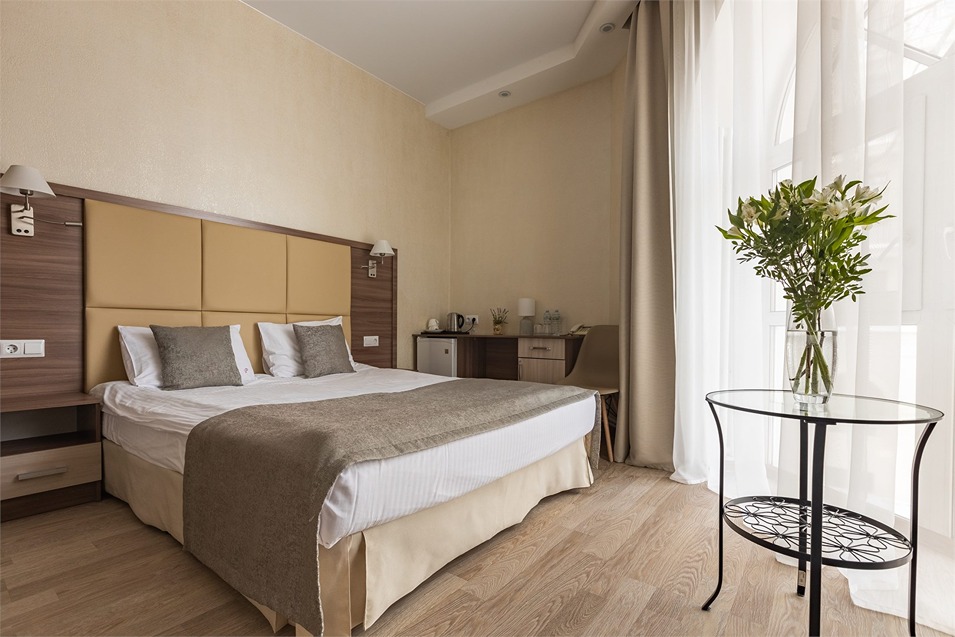 В номере: вешалка, зеркало, кровать двуспальная, прикроватные тумбочки, стол, стулья, шкаф, кондиционер, мини-холодильник, сейф, телевизор, телефон