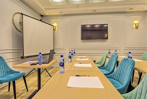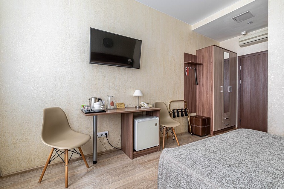 В номере: вешалка, зеркало, кресло-кровать, кровать двуспальная, прикроватные тумбочки, стол, стулья, шкаф, кондиционер, мини-холодильник, сейф, телевизор, телефон, чайная станция, чайный набор посуды