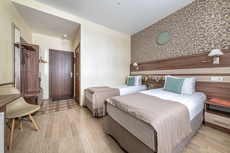 В номере: вешалка, зеркало, кровати односпальные /одна двуспальная кровать, прикроватные тумбочки, стол, стулья, шкаф, кондиционер, мини-холодильник, сейф, телевизор, телефон