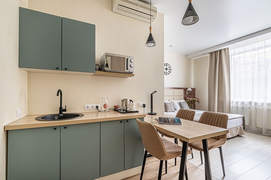 В номере: вешалка, диван раскладной, зеркало, кровать двуспальная, прикроватные тумбочки, стол, стулья, шкаф, кондиционер, микроволновая печь, мини-холодильник, набор посуды, сейф, стиральная машина, телевизор, телефон, чайная станция, чайный набор посуды