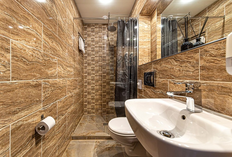 Санузел: с душем, тапочки, теплый пол, туалетные принадлежности, фен, халат