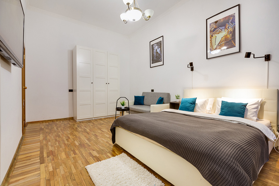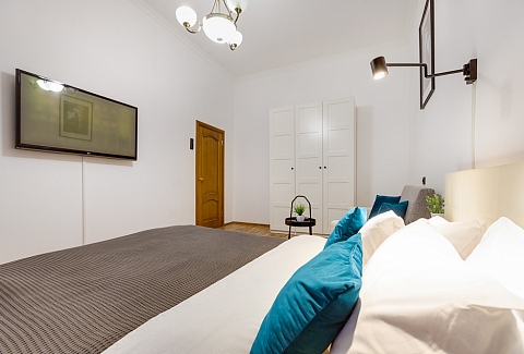 В номере: вешалка, диван раскладной, зеркало, кровать двуспальная, прикроватные тумбочки, стол, стулья, шкаф, духовой шкаф, микроволновая печь, набор посуды, плита газовая, стиральная машина, телевизор, холодильник, электрочайник
