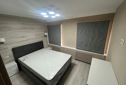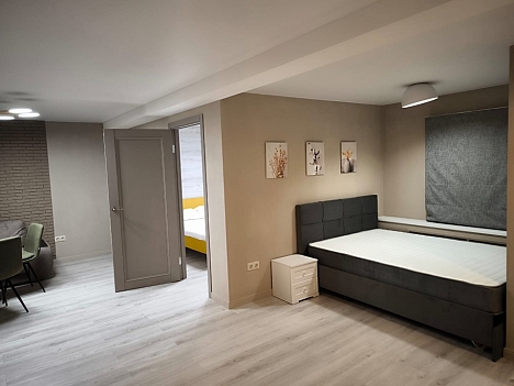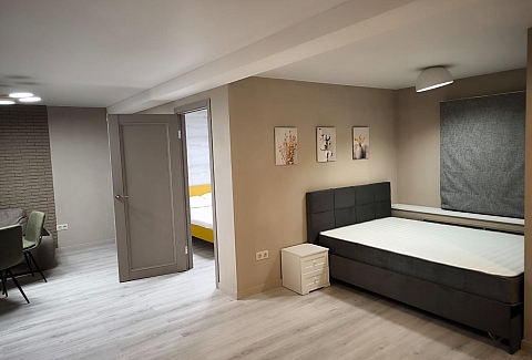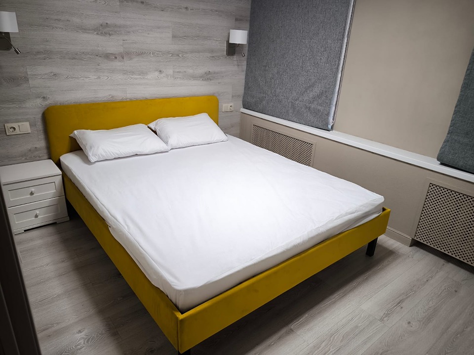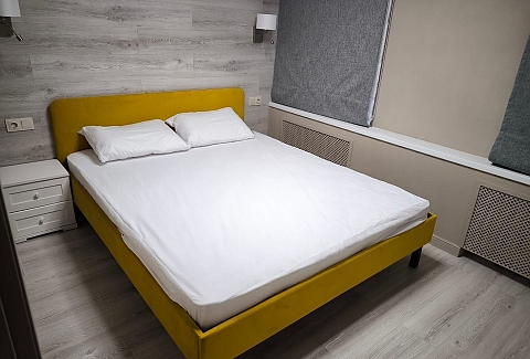 В номере: вешалка, диван раскладной, зеркало, кровать двуспальная, прикроватные тумбочки, стол, стулья, шкаф, гладильная доска, микроволновая печь, мини-холодильник, набор посуды, плита электрическая, стиральная машина, телевизор, утюг, электрочайник