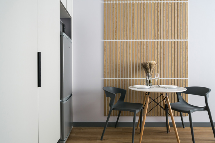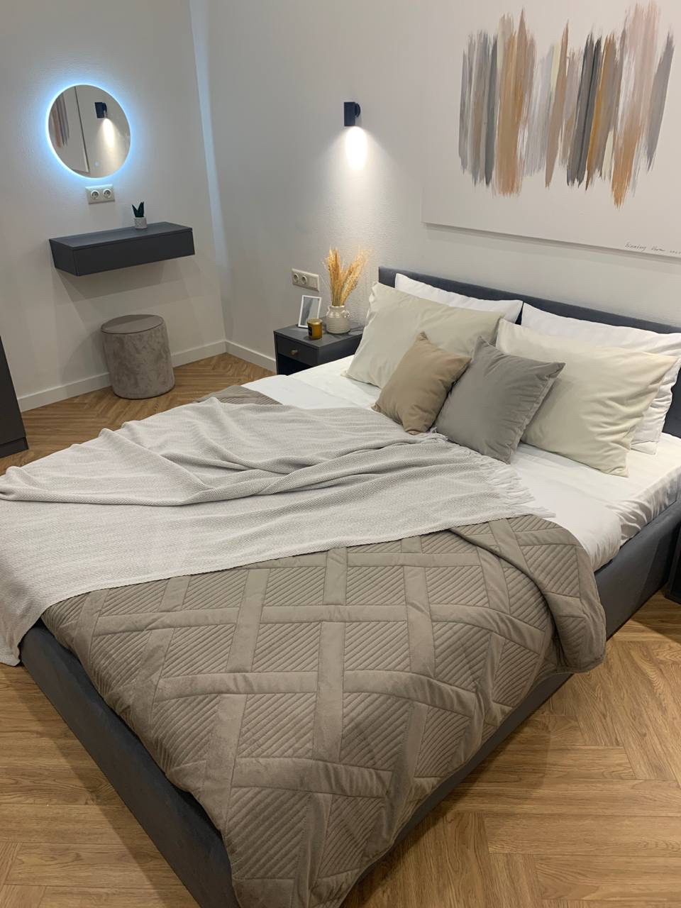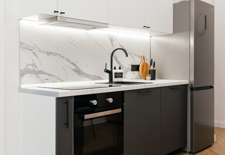 В номере: вешалка, зеркало, кресло, кровать двуспальная, стол, стулья, шкаф, духовой шкаф, микроволновая печь, набор посуды, плита электрическая, посудомоечная машина, стиральная машина, телевизор, холодильник, электрочайник