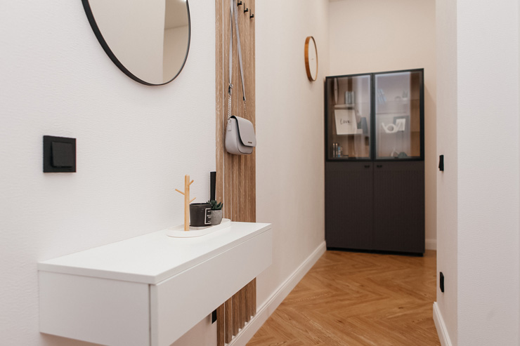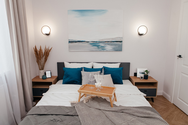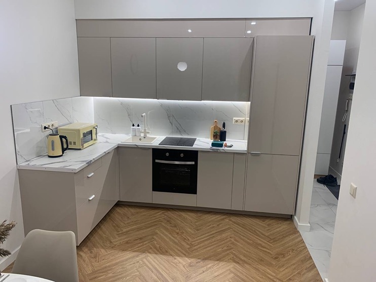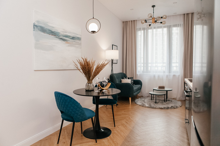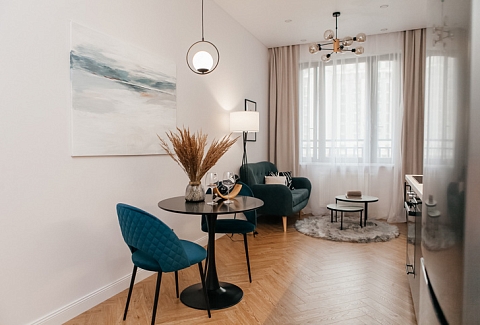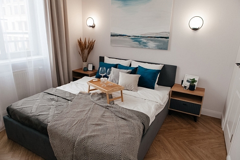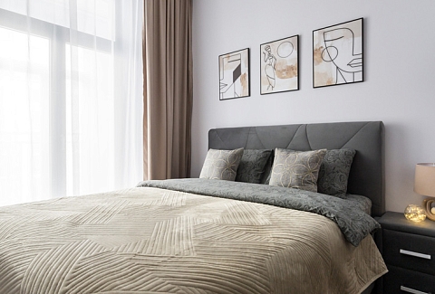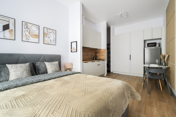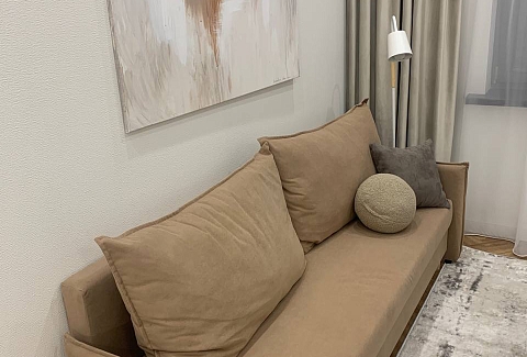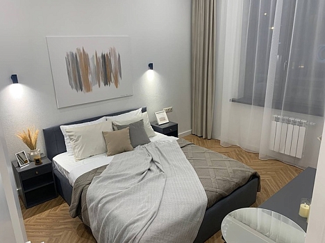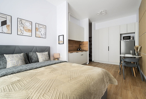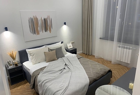 В номере: вешалка, диван, зеркало, кровать двуспальная, стол, стулья, шкаф, духовой шкаф, микроволновая печь, набор посуды, плита электрическая, посудомоечная машина, стиральная машина, телевизор, холодильник, электрочайник