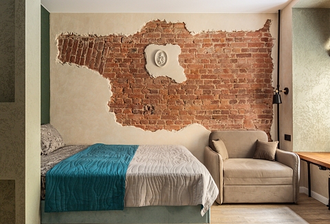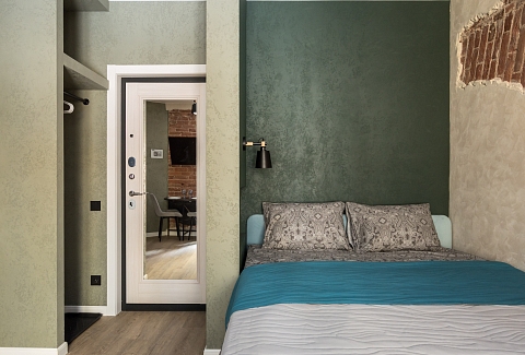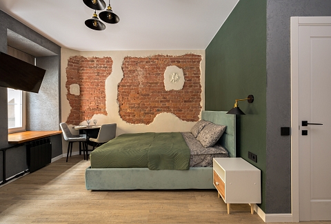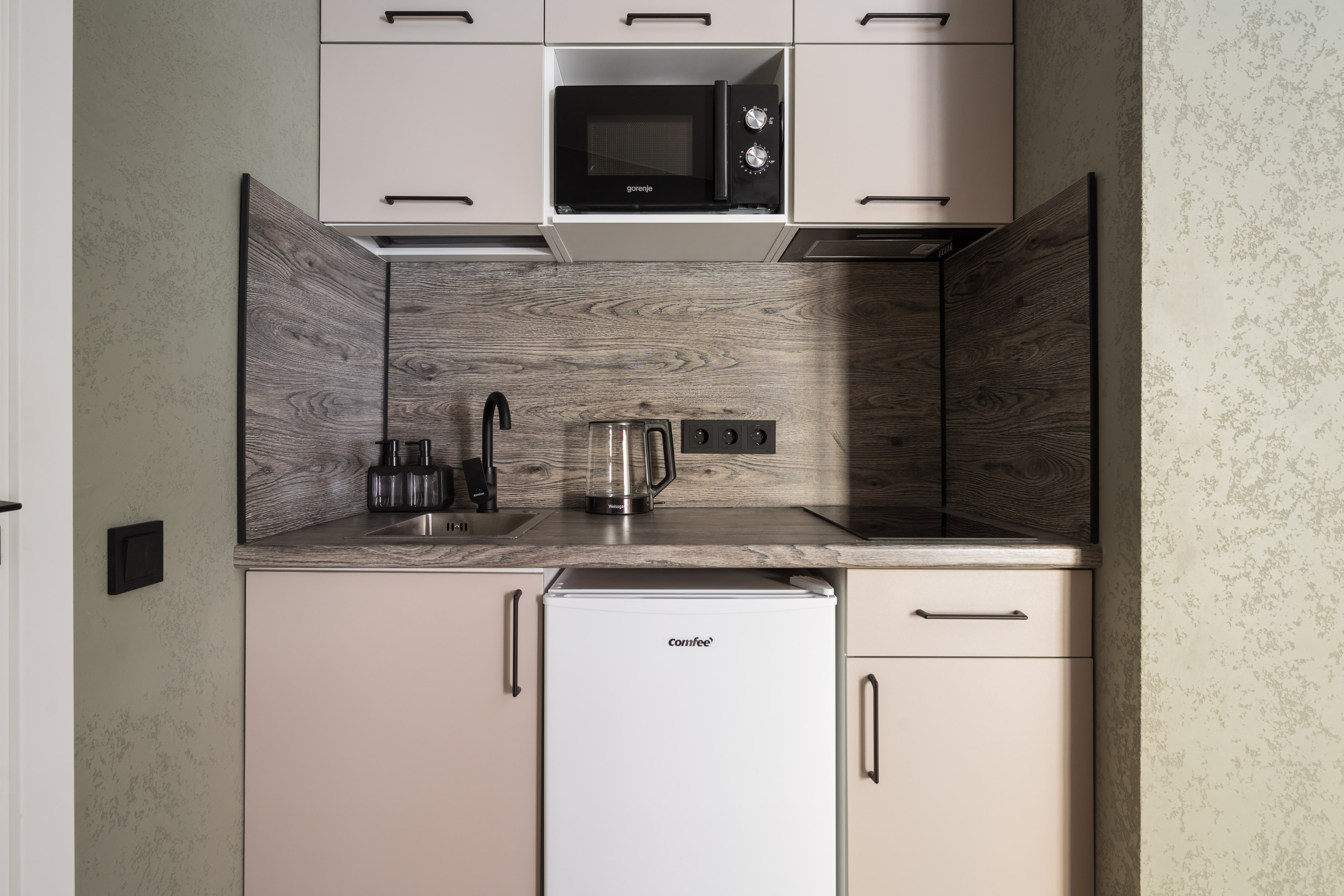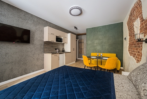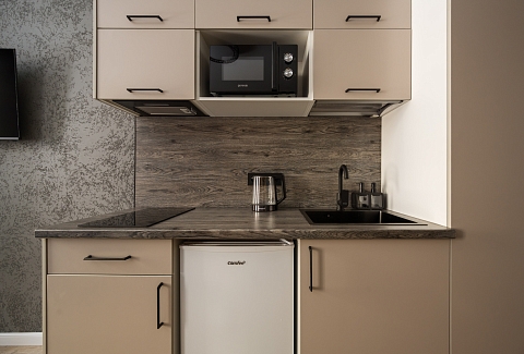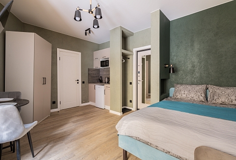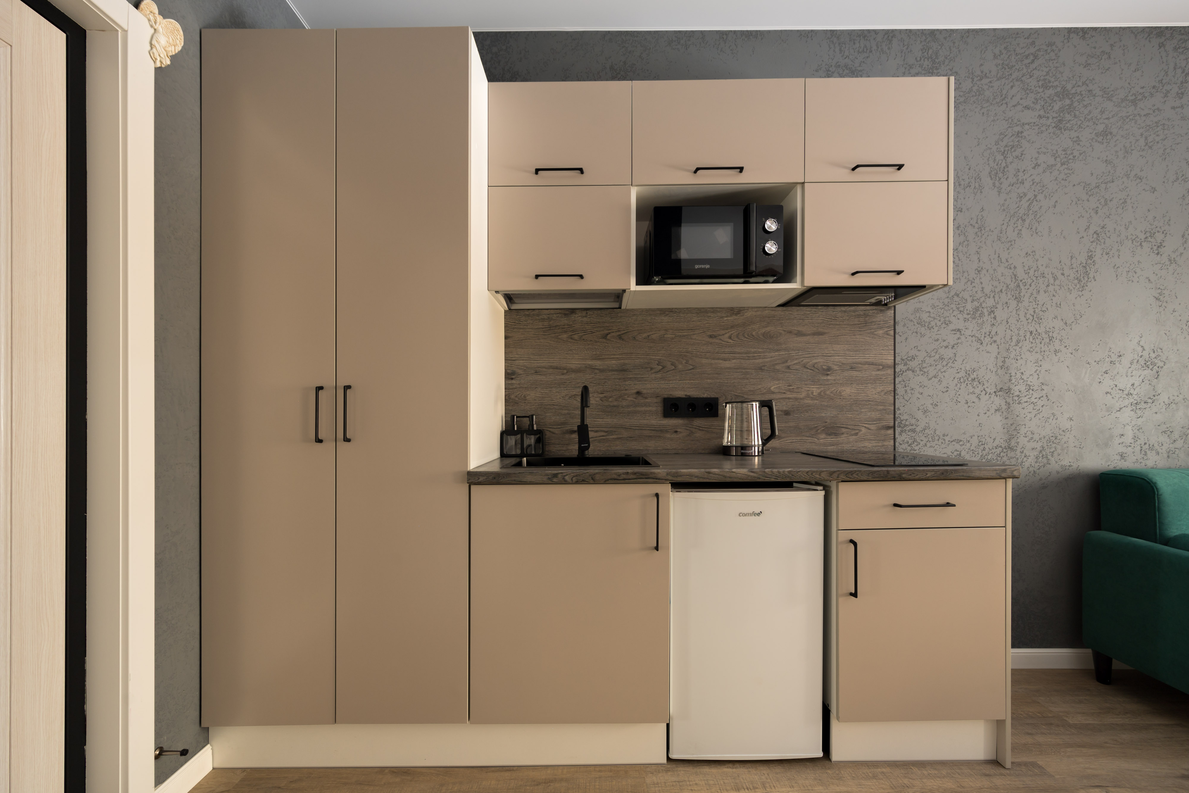 В номере: вешалка, кресло-кровать, кровать двуспальная, стол, стулья, шкаф, микроволновая печь, мини-холодильник, набор посуды, плита, телевизор, электрочайник