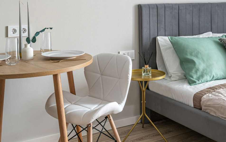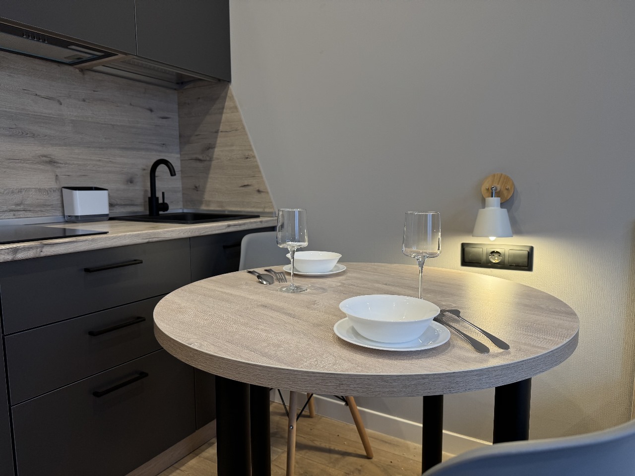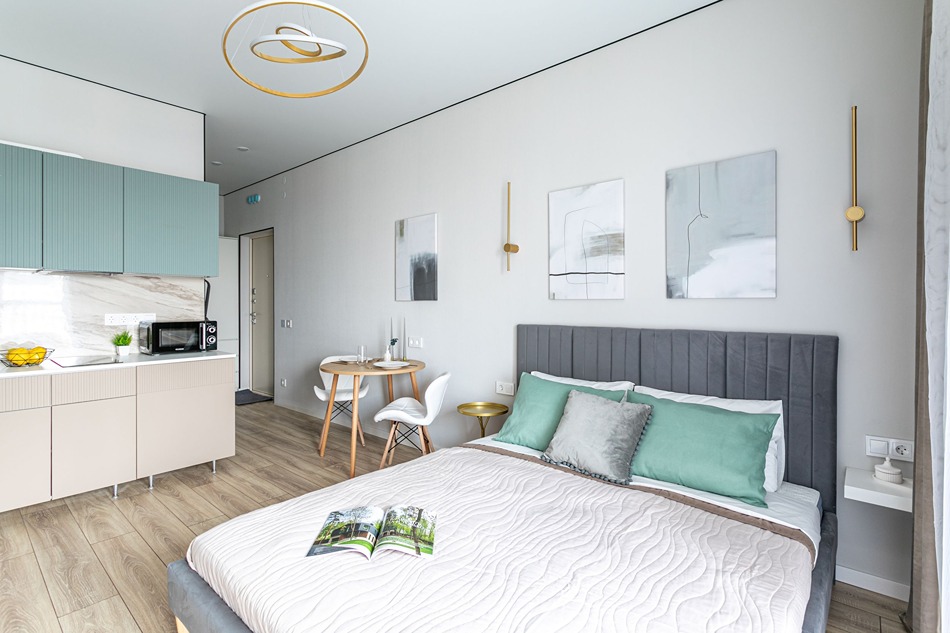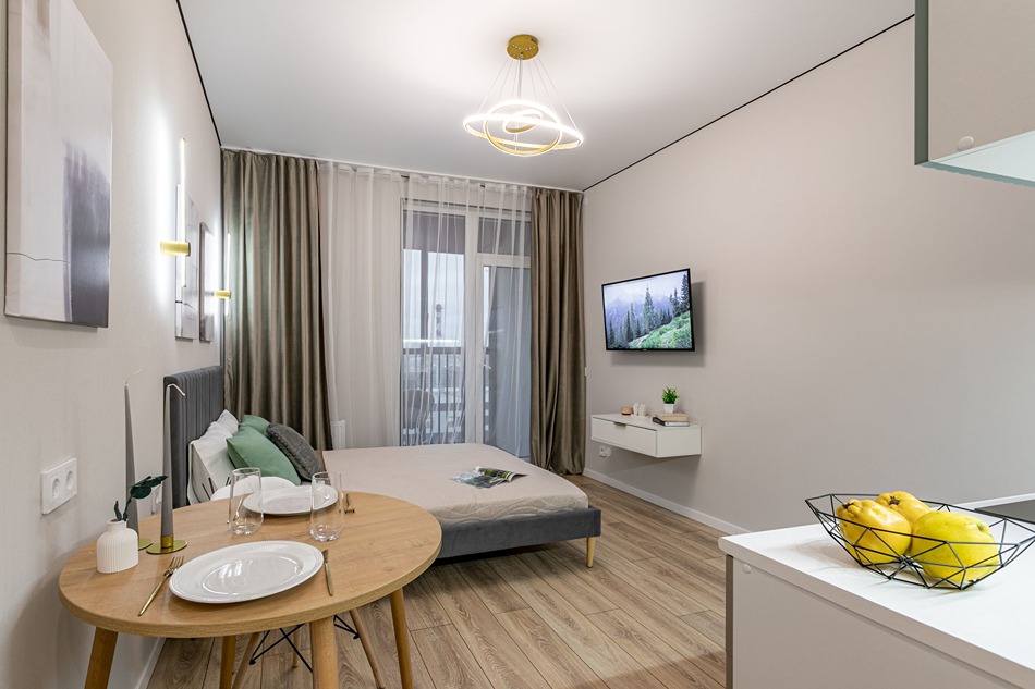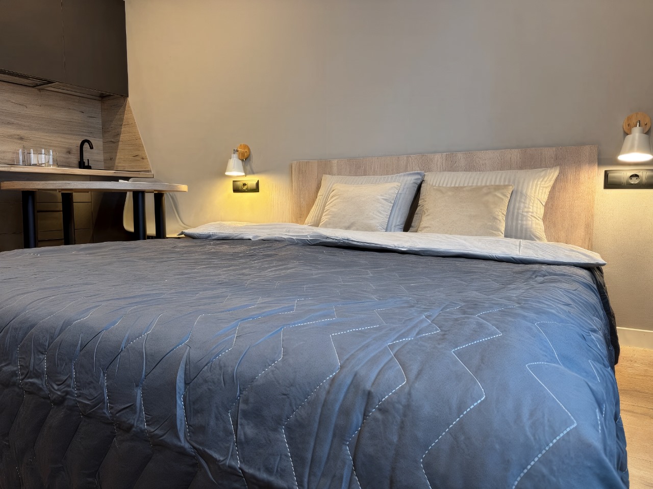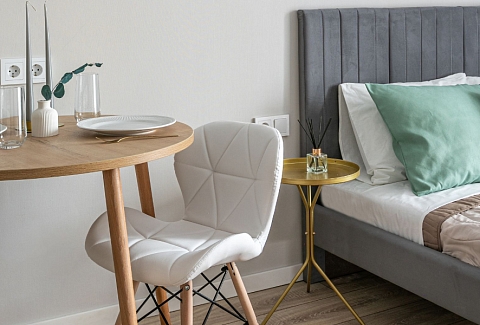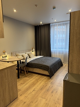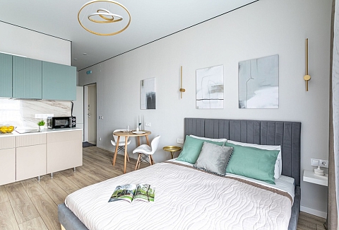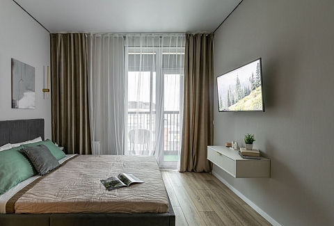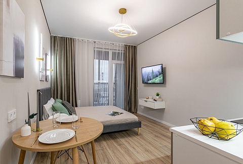 В номере: вешалка, зеркало, кровать двуспальная, прикроватные тумбочки, стол, стулья, шкаф, микроволновая печь, мини-холодильник, набор посуды, плита электрическая, телевизор, электрочайник