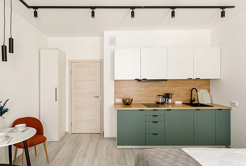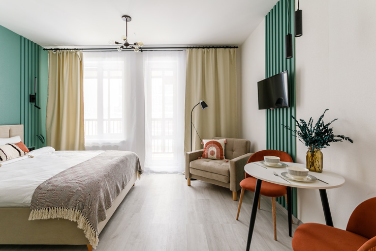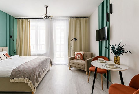 В номере: вешалка, зеркало, кресло, кровать двуспальная, стол, стулья, шкаф, микроволновая печь, мини-холодильник, набор посуды, плита электрическая, сейф, стиральная машина, телевизор, утюг, электрочайник