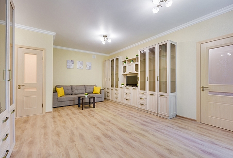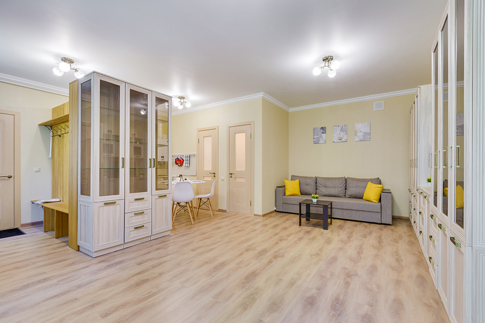 В номере: вешалка, диван раскладной, зеркало, кровать двуспальная, стол, стулья, шкаф, микроволновая печь, набор посуды, плита газовая, стиральная машина, телевизор, холодильник, электрочайник