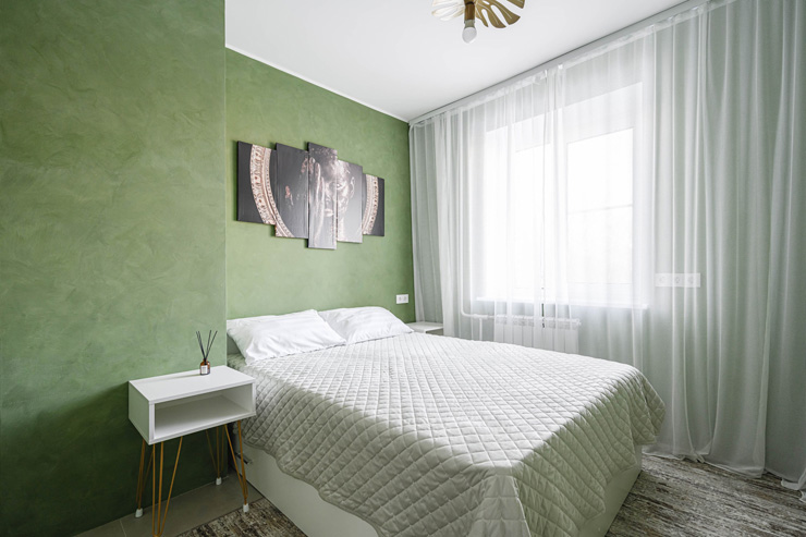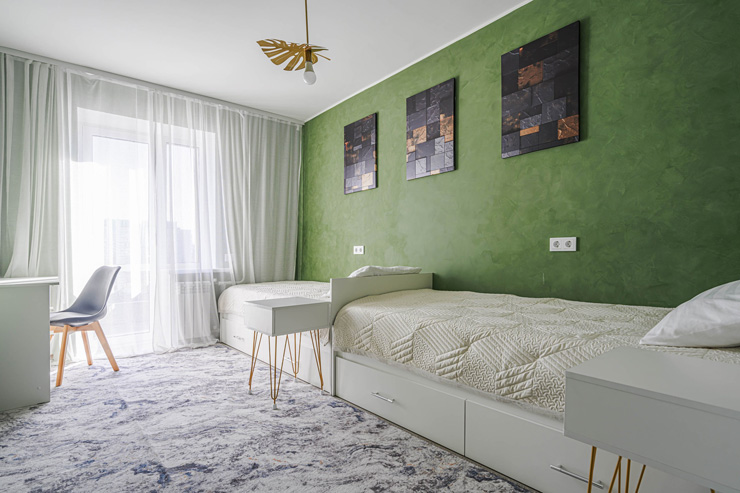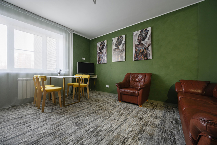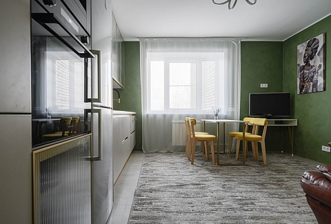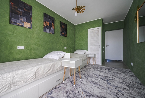 В номере: вешалка, диван раскладной, зеркало, кресла, кровати односпальные, кровать двуспальная, прикроватные тумбочки, стол, стулья, шкаф, духовой шкаф, микроволновая печь, набор посуды, плита электрическая, посудомоечная машина, стиральная машина, телевизор, утюг, холодильник, электрочайник