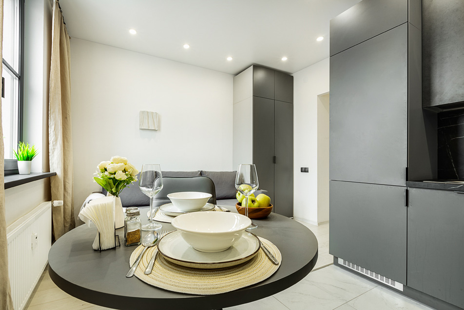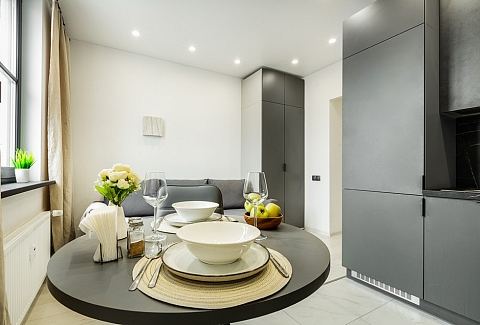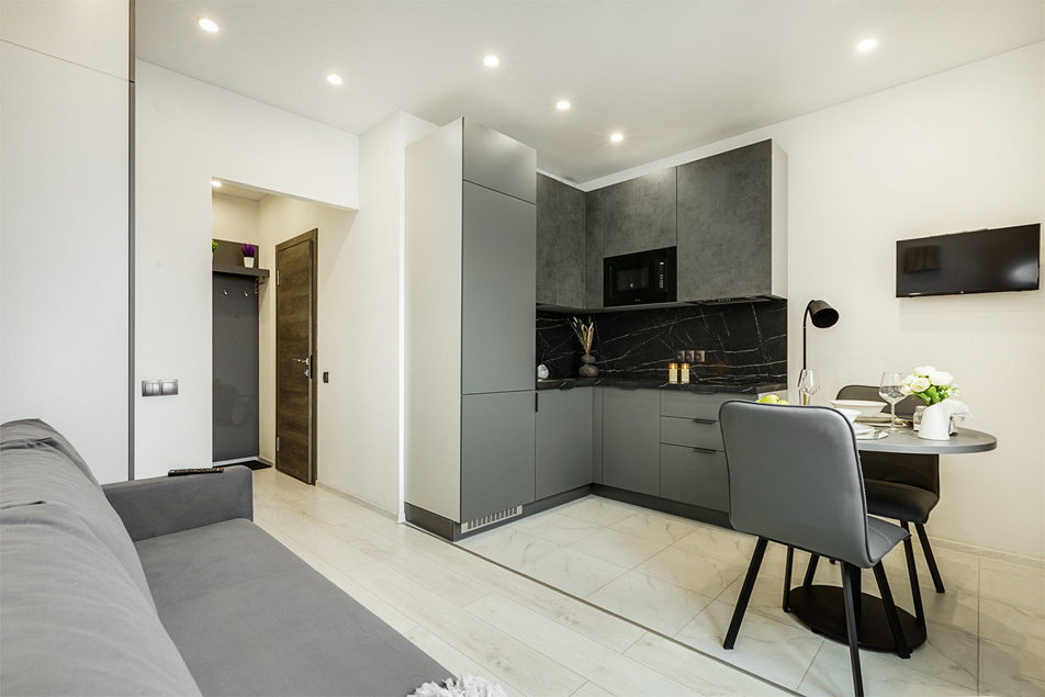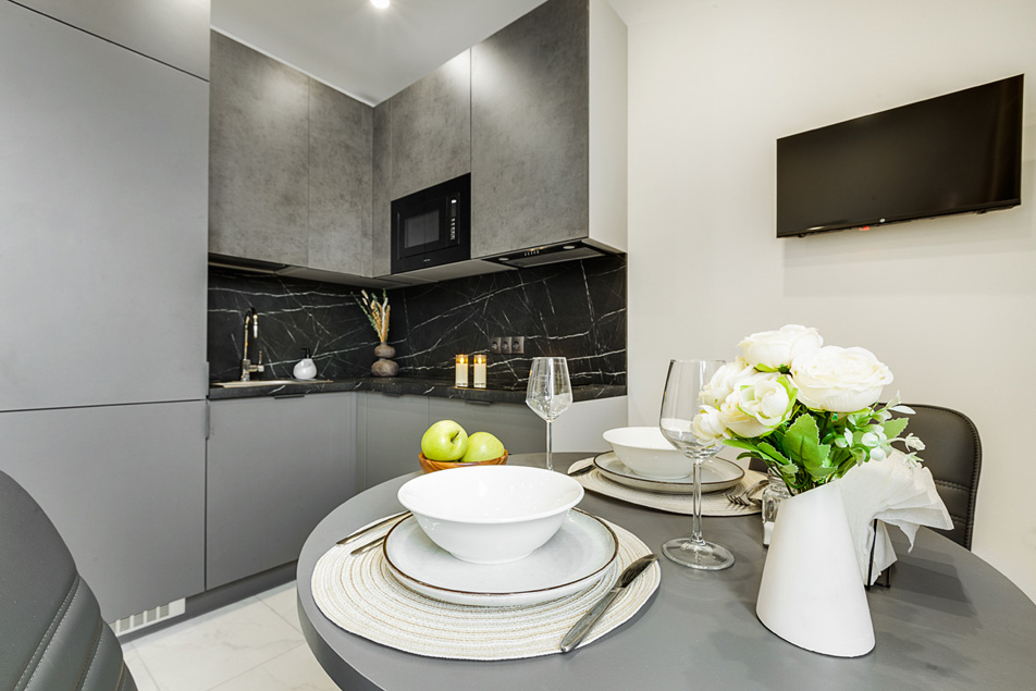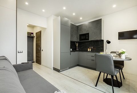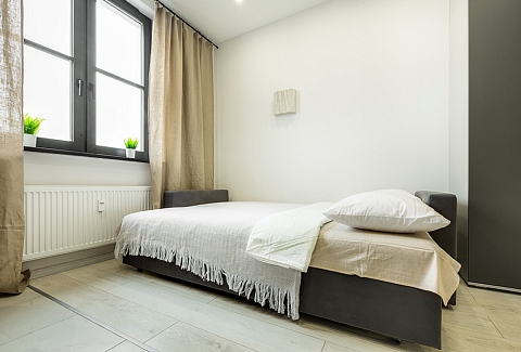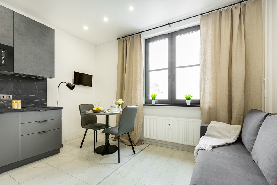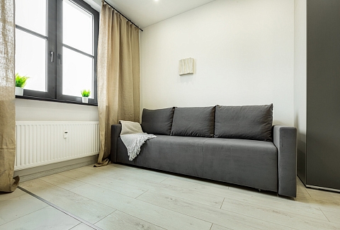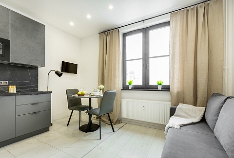 В номере: вешалка, диван раскладной, зеркало, стол, стулья, шкаф, микроволновая печь, набор посуды, плита электрическая, стиральная машина, телевизор, холодильник, электрочайник