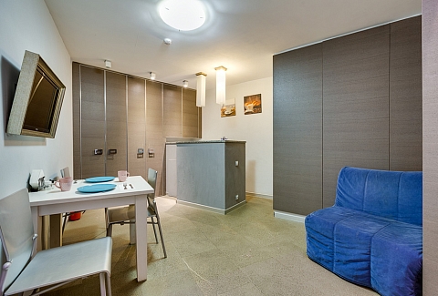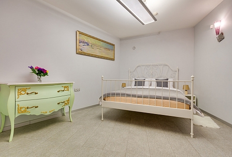 В номере: вешалка, зеркало, кресло-кровать, кровать двуспальная, прикроватные тумбочки, стол, стулья, шкаф, микроволновая печь, мини-холодильник, набор посуды, плита электрическая, стиральная машина, телевизор, электрочайник