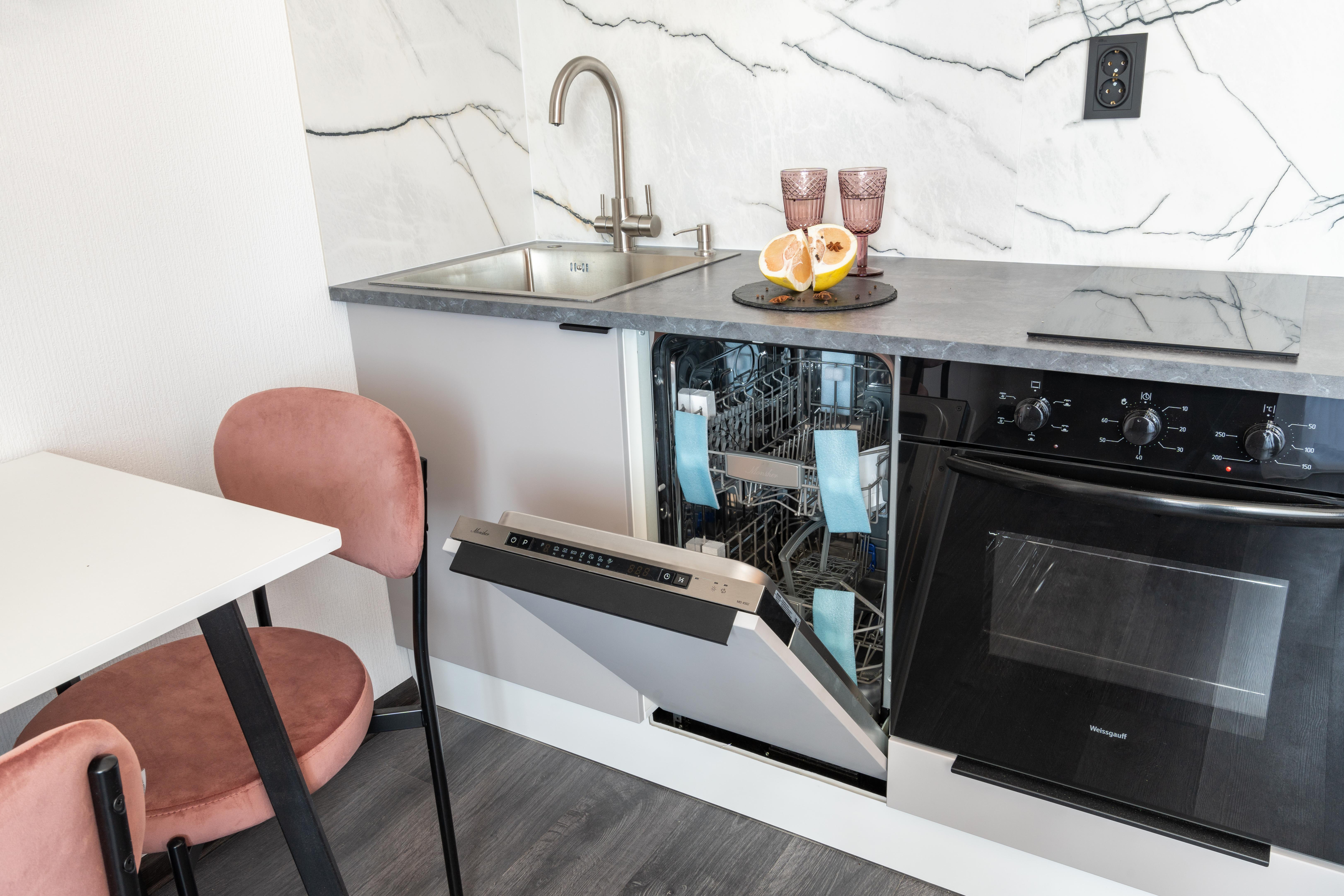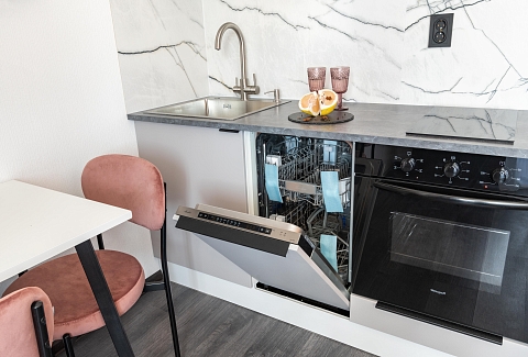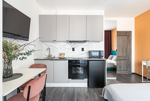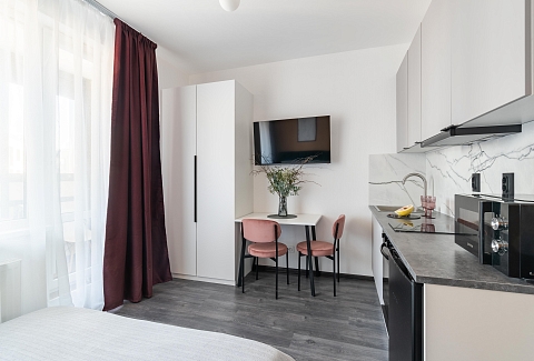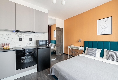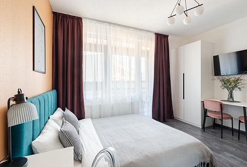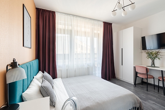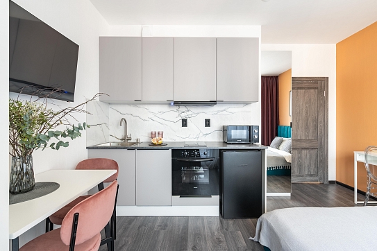 В пешей доступности множество магазинов, кафе и фитнес-залов, салонов красоты. До центра города около 12 километров. В апартаментах есть все необходимое для комфортного проживания. Удобная и современная мебель, санузел с душевой кабиной. Апартаменты оборудованы мини-кухней с духовым шкафом, электроплитой, посудомоечной машиной, мини-холодильником, электрочайником, набором посуды. Кроме того, предусмотрены телевизор, стиральная машина, интернет Wi-Fi.