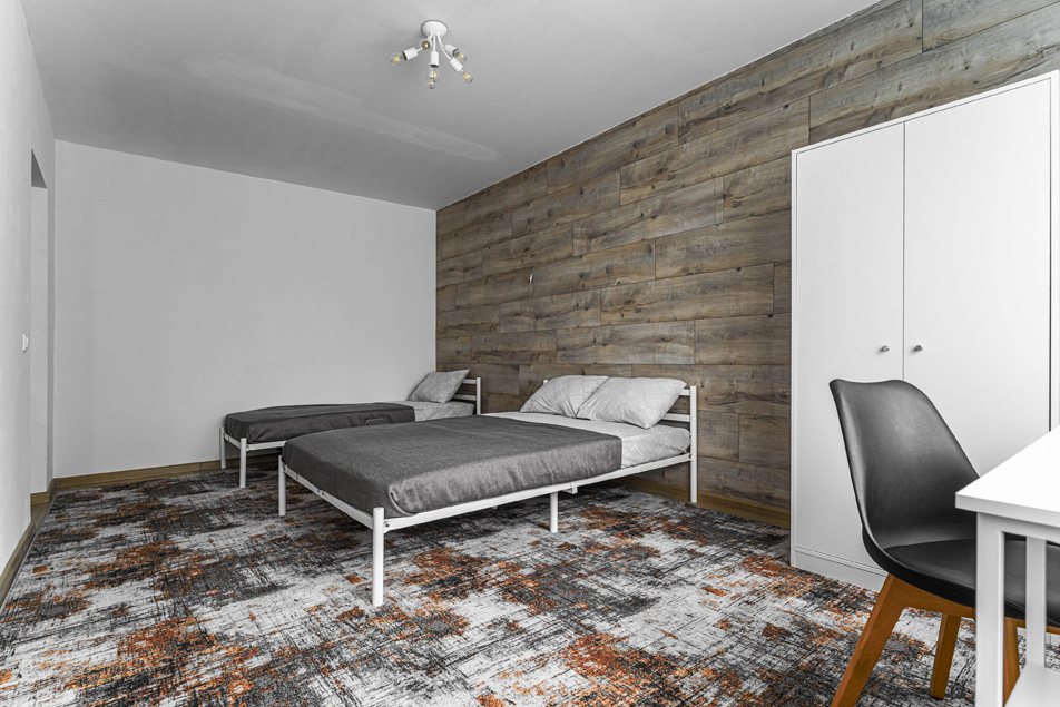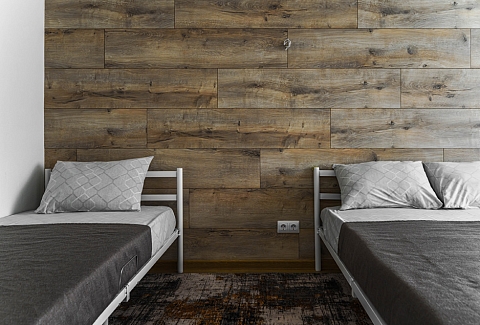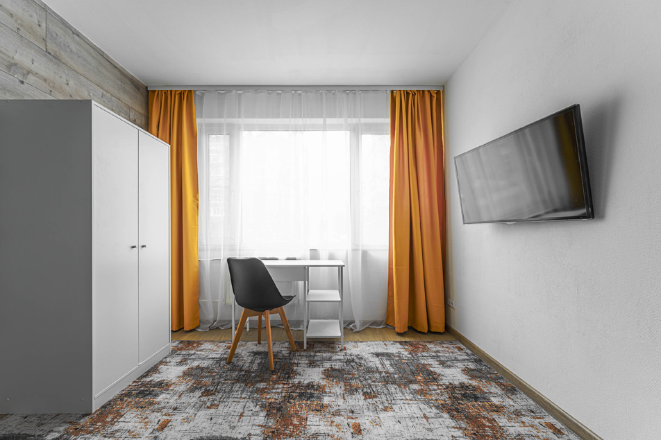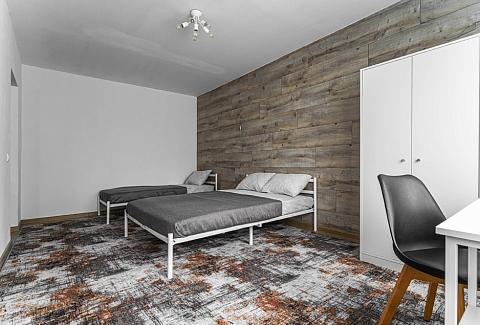 В номере: вешалка, гардеробная, зеркало, кровать двуспальная, кровать односпальная, стол, стулья, микроволновая печь, набор посуды, плита электрическая, стиральная машина, телевизор, холодильник, электрочайник