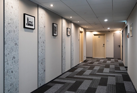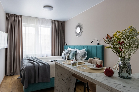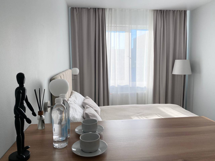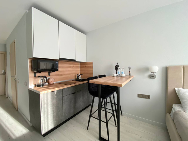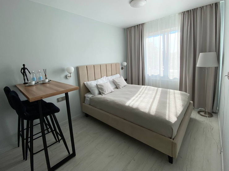 На первом этаже работает ресепшн. На внутридворовой территории оборудованы места для отдыха.Номерной фонд включает 2 стильные студии, оснащенные всей необходимой для комфортного проживания одного или двух гостей мягкой и корпусной мебелью, бытовой техникой. Жилые зоны укомплектованы двуспальной кроватью, кухонные — рабочим пространством для приготовления еды и барной стойкой. В санузле установлена душевая кабина. Можно подключиться к Wi-Fi.