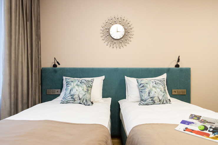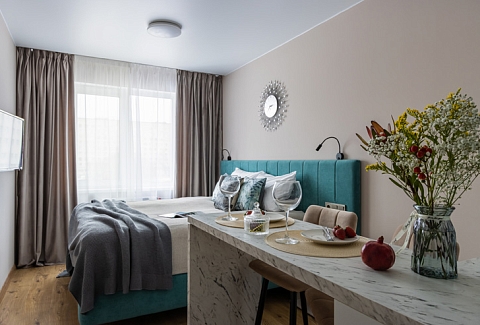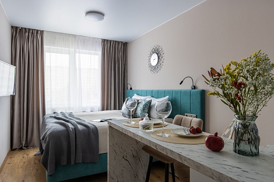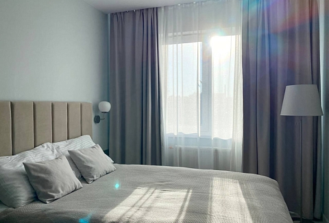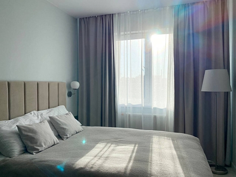 В номере: вешалка, зеркало, кровать двуспальная, стол, стулья, микроволновая печь, мини-холодильник, набор посуды, плита электрическая, сейф, стиральная машина, телевизор, утюг, электрочайник
