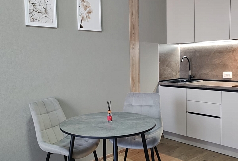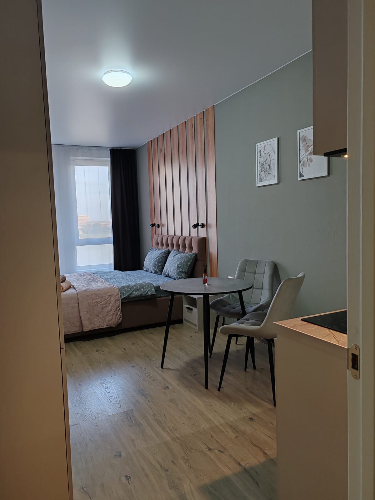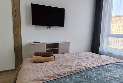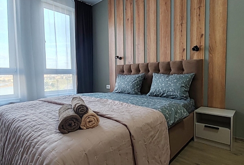В номере: вешалка, зеркало, кровать двуспальная, прикроватные тумбочки, стол, стулья, шкаф, микроволновая печь, набор посуды, плита электрическая, телевизор, холодильник, электрочайник