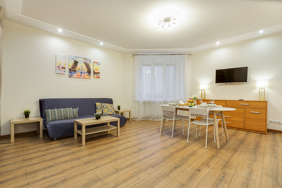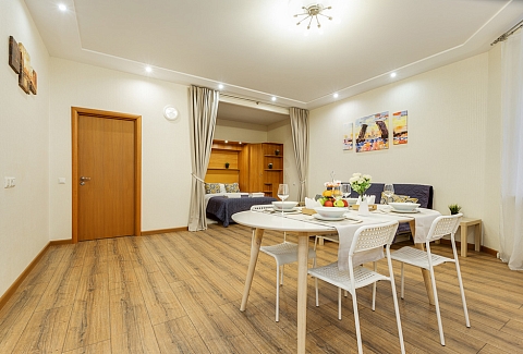 Кухонная зона оснащена всей необходимой техникой и посудой для приготовления еды. Принимать пищу можно за барной стойкой или за обеденным столом. Недалеко от апартаментов находятся известные рестораны с европейской и азиатской кухней. В непосредственной близости от апартаментов расположены многочисленные исторические здания, Таврический сад и Воскресенская набережная.