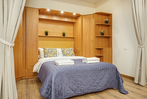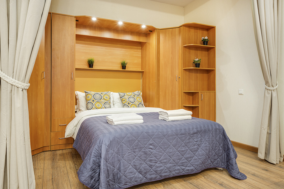 В номере: вешалка, диван раскладной, зеркало, кровать двуспальная, прикроватные тумбочки, стол, стулья, шкаф, духовой шкаф, микроволновая печь, набор посуды, плита газовая, телевизор, холодильник, электрочайник