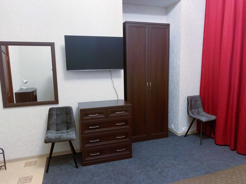 В номере: вешалка, диван раскладной, зеркало, кровать двуспальная, стол, стулья, шкаф, телевизор