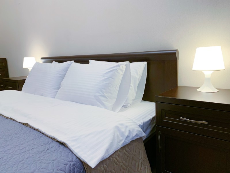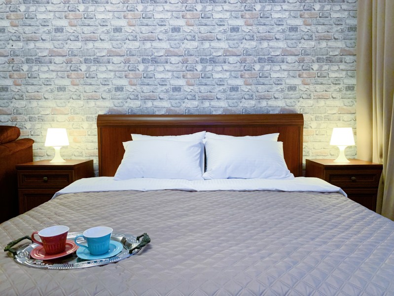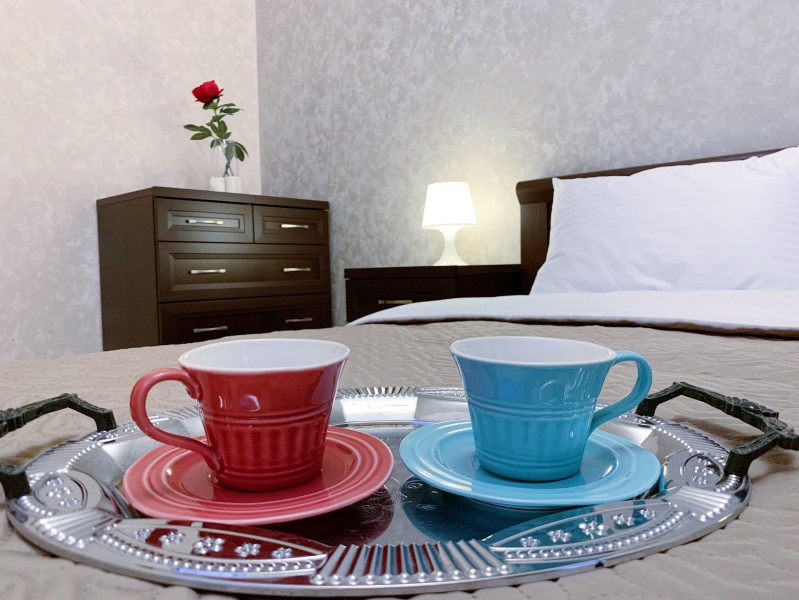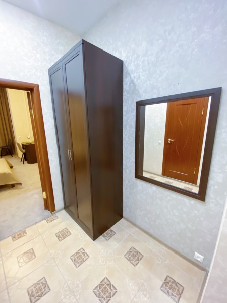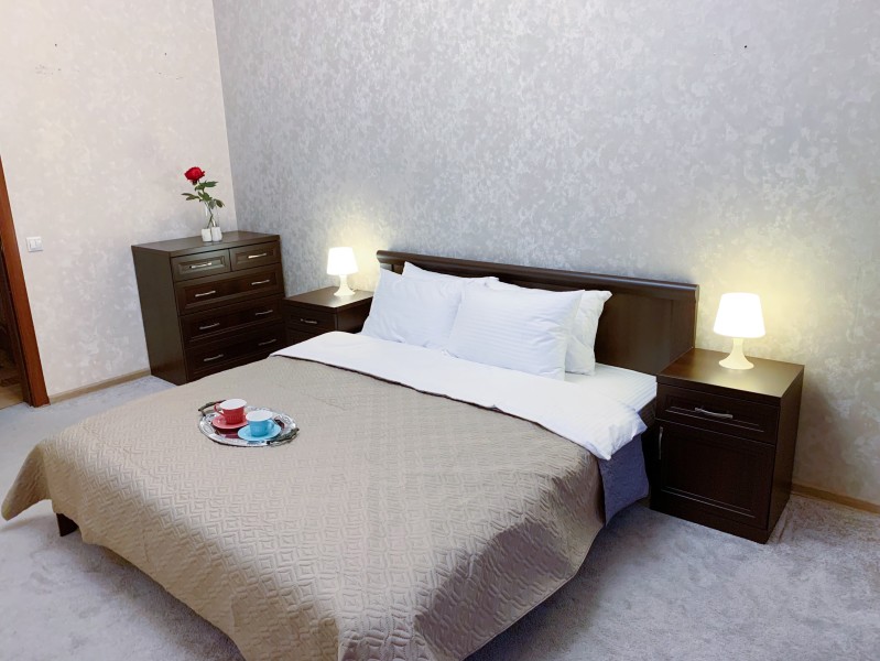 В номере: вешалка, зеркало, кровать двуспальная, прикроватные тумбочки, стол, стулья, шкаф, микроволновая печь, набор посуды, плита газовая, телевизор, холодильник, электрочайник