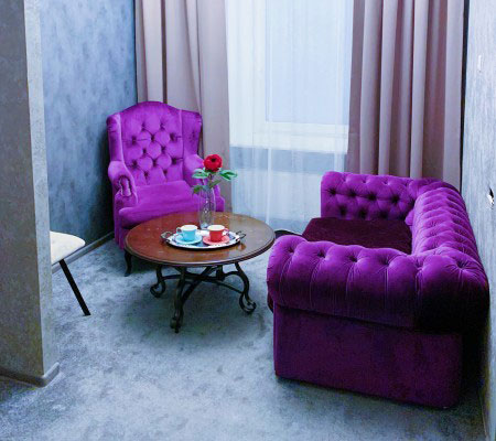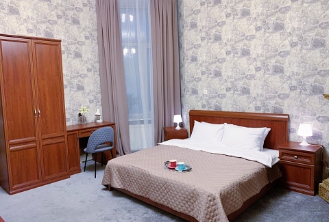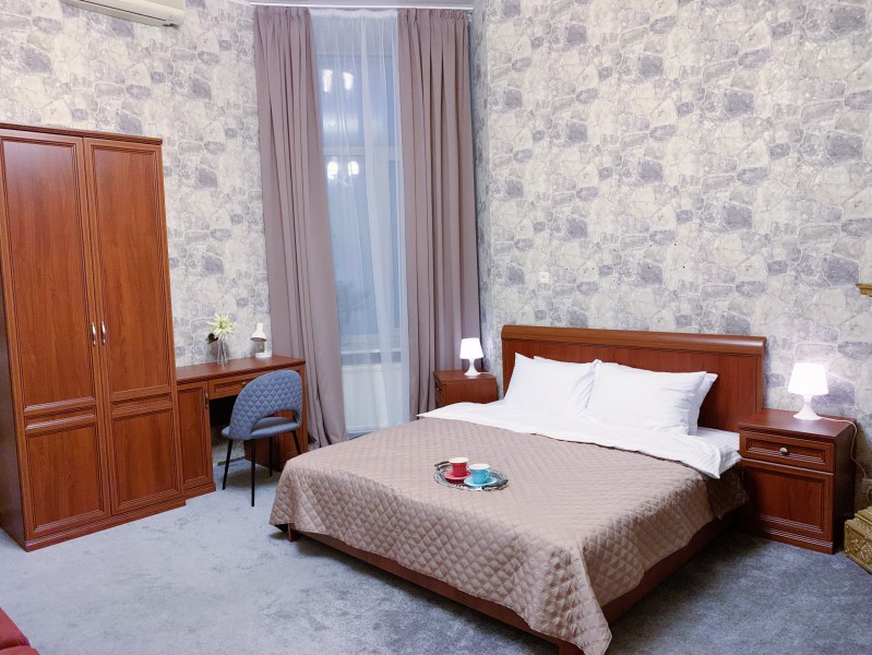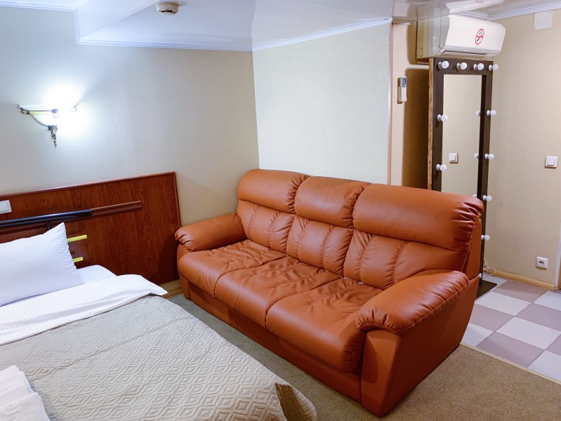 В номере: вешалка, диван, диван раскладной, зеркало, кресло, кровать двуспальная, прикроватные тумбочки, стол, стулья, шкаф, телевизор