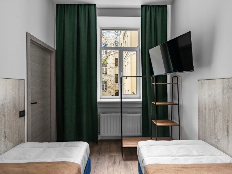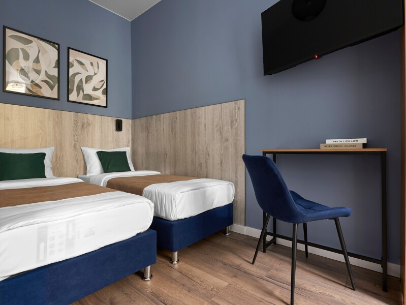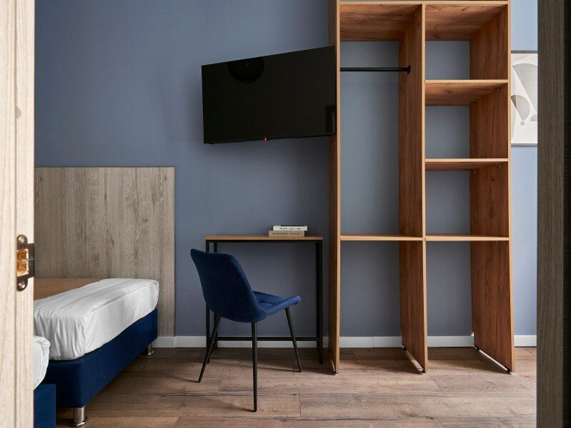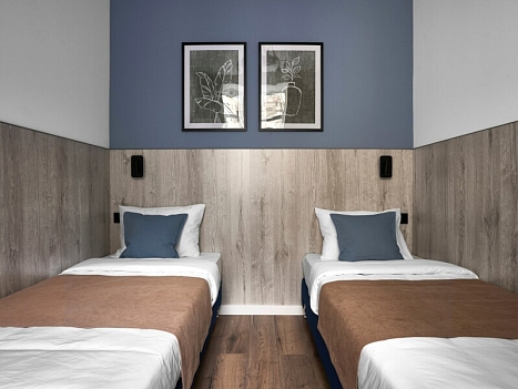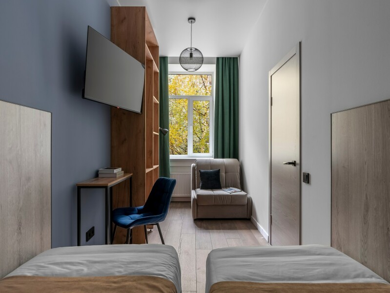 В номере: вешалка, диван раскладной, зеркало, кровати односпальные, прикроватные тумбочки, стол, стул, мини-холодильник, обогреватель, телевизор, утюг, чайник