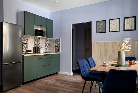 В номере: вешалка, зеркало, кровати односпальные, кровать двуспальная, стол, стулья, шкаф, микроволновая печь, мини-холодильник, набор посуды, плита, телевизор, чайник