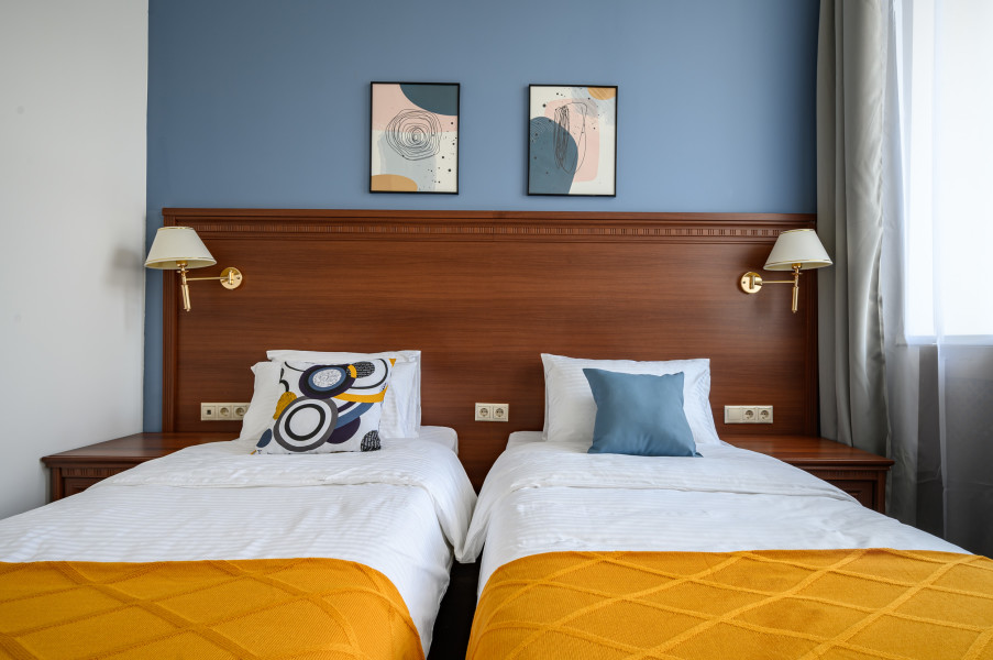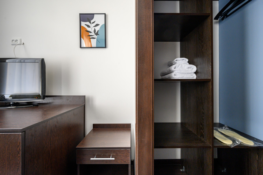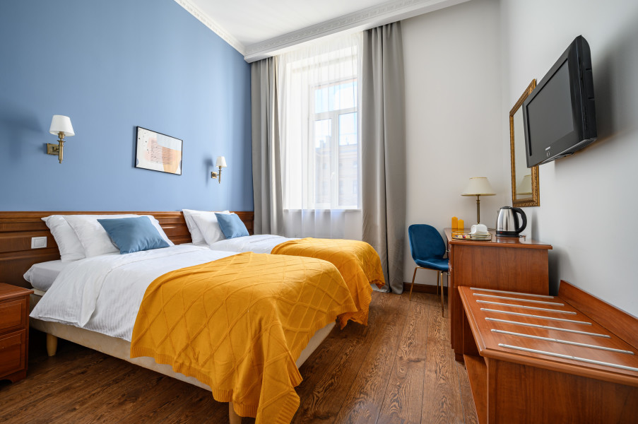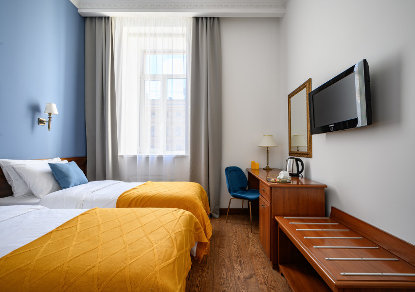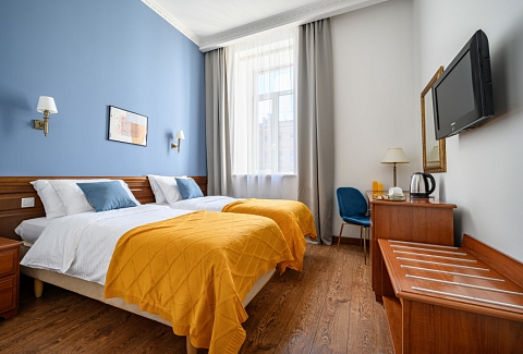 В номере: кровати односпальные, стол, стул, кондиционер, мини-холодильник, телевизор, чайная станция, чайный набор посуды