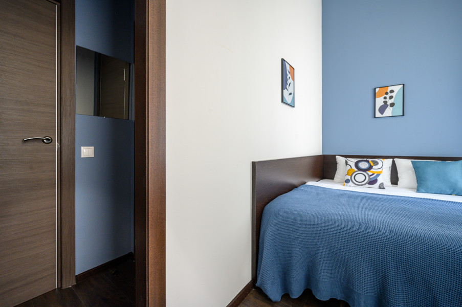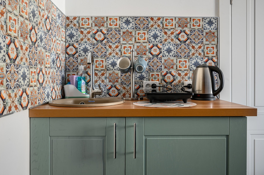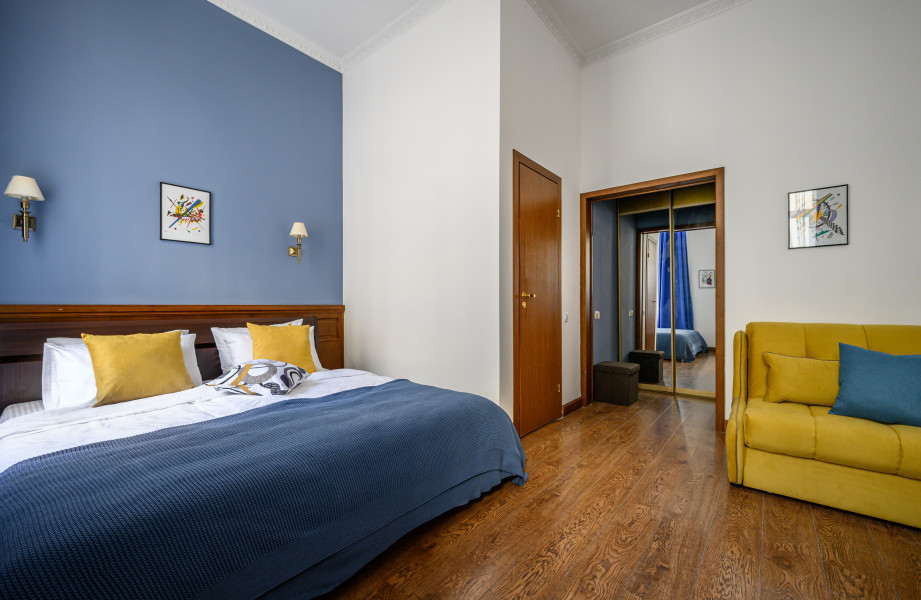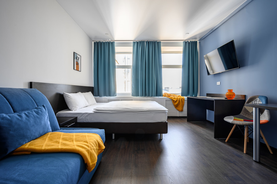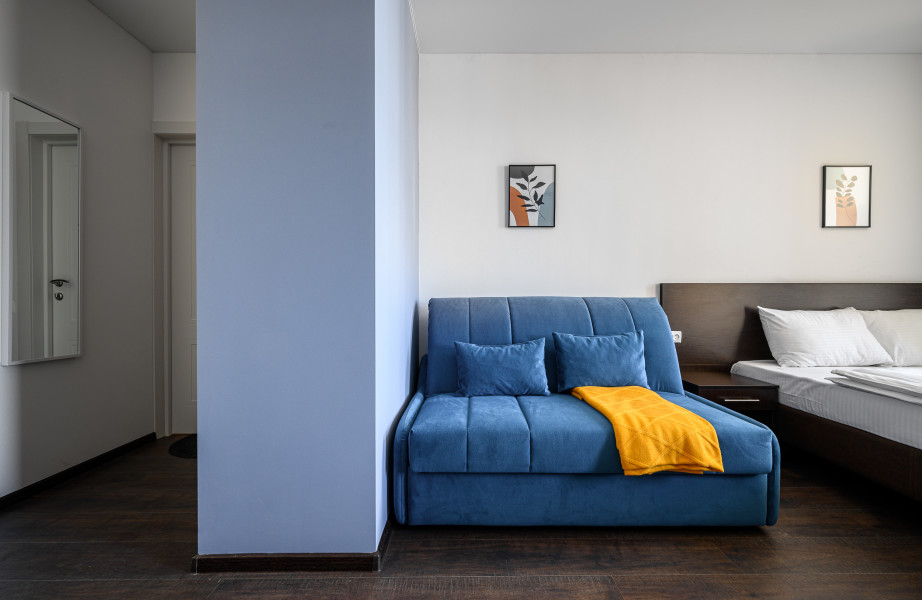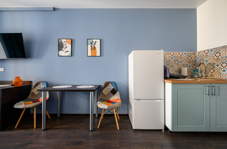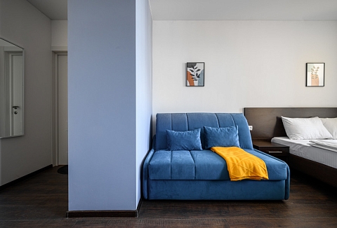В номере: диван раскладной, кровать двуспальная, стол, стулья, кондиционер, микроволновая печь, мини-холодильник, набор посуды, плита электрическая, телевизор, электрочайник