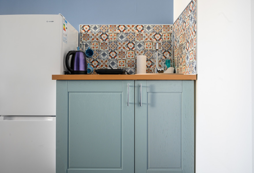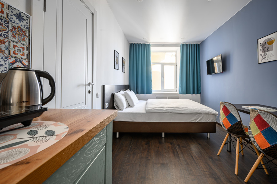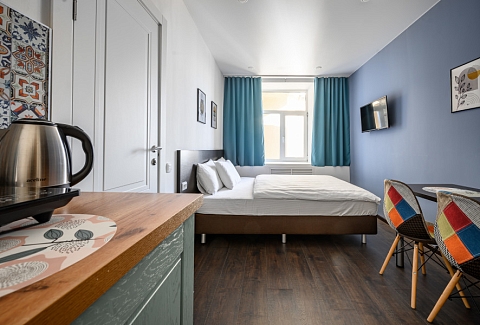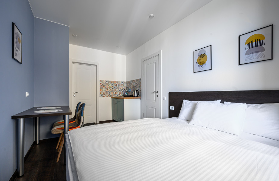 В номере: кровать двуспальная, стол, стулья, кондиционер, микроволновая печь, мини-холодильник, набор посуды, плита электрическая, телевизор, электрочайник