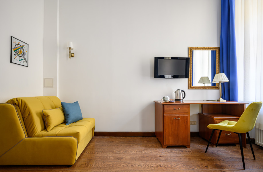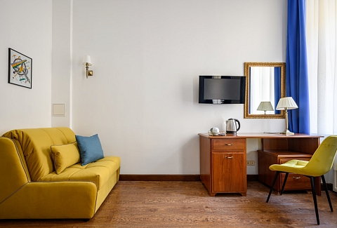 В номере: кресло-кровать, кровать двуспальная, стол, стул, кондиционер, мини-холодильник, телевизор, чайная станция, чайный набор посуды