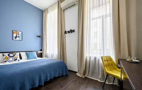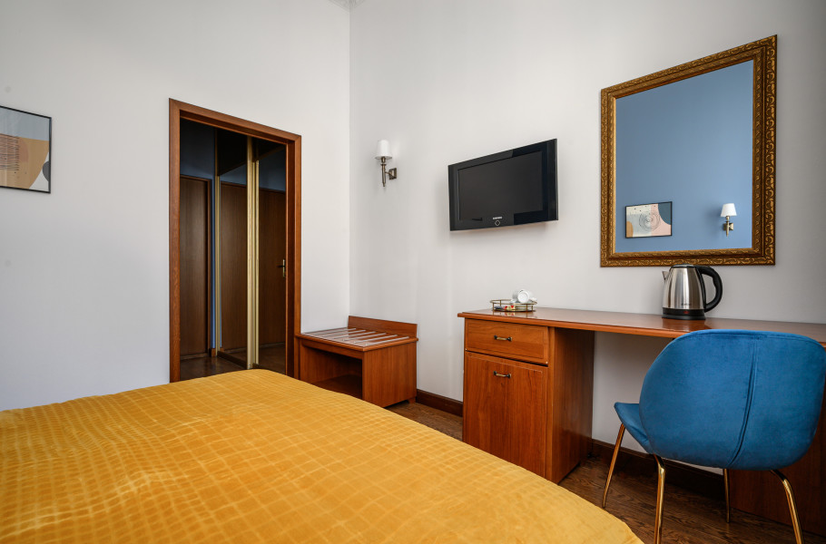 В номере: кровать двуспальная, стол, стул, кондиционер, мини-холодильник, телевизор, чайная станция, чайный набор посуды