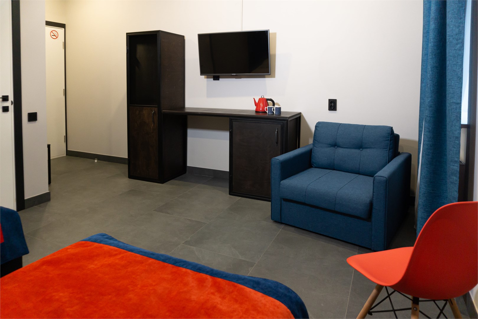 В номере: кровати односпальные /одна двуспальная кровать, прикроватные столики, стол, стулья, шкаф, телевизор, чайная станция