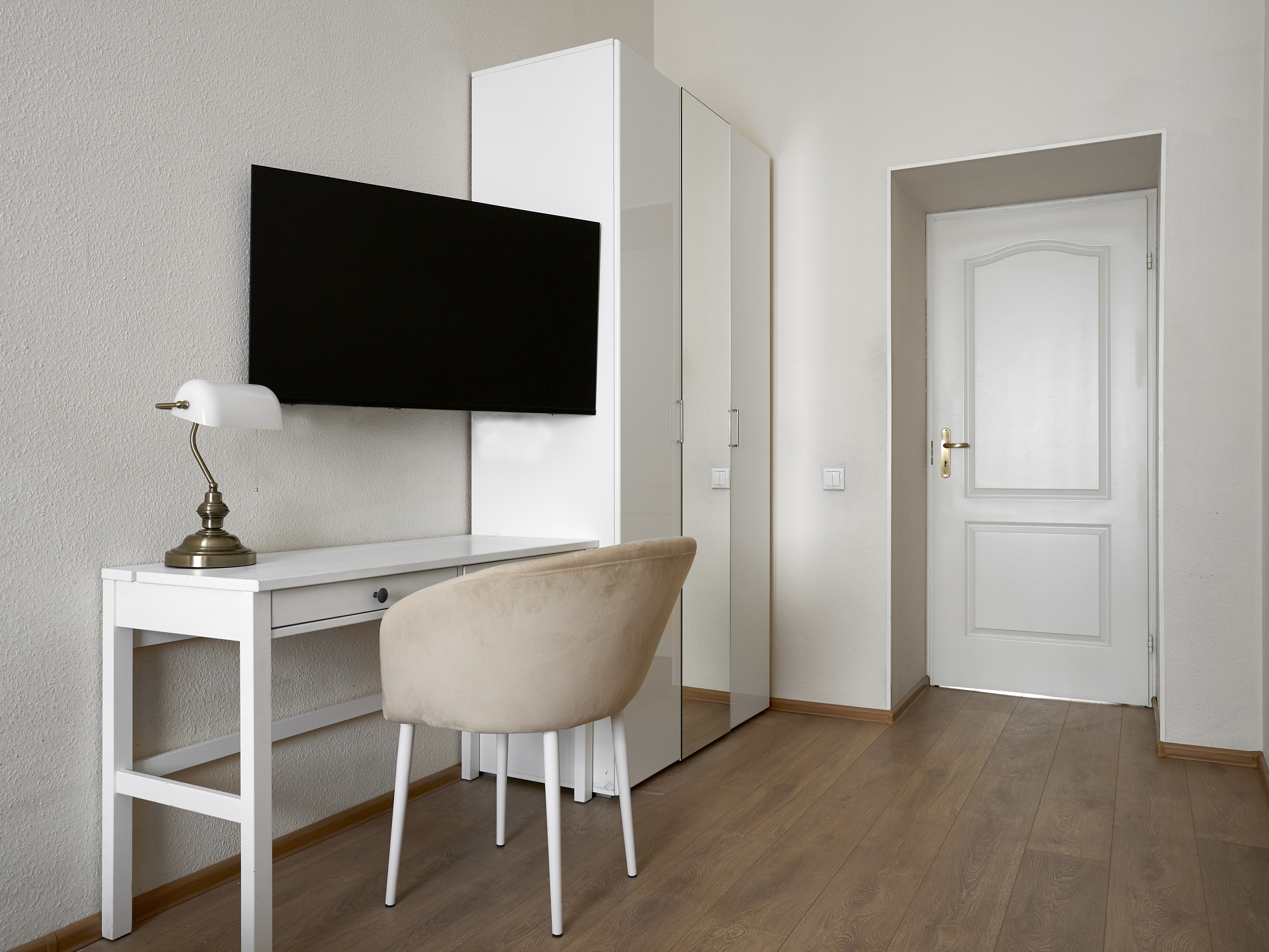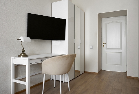 В номере: вешалка, диван раскладной, зеркало, кресла, кровать двуспальная, набор мягкой мебели, прикроватные тумбочки, стол, стол для компьютера, столик журнальный, столик кофейный, стулья, тумба под телевизор, шкаф-купе, шкаф встроенный, гладильная доска, камин, микроволновая печь, набор посуды, посудомоечная машина, стиральная машина, телевизор, утюг, холодильник, чайный набор посуды, электрочайник