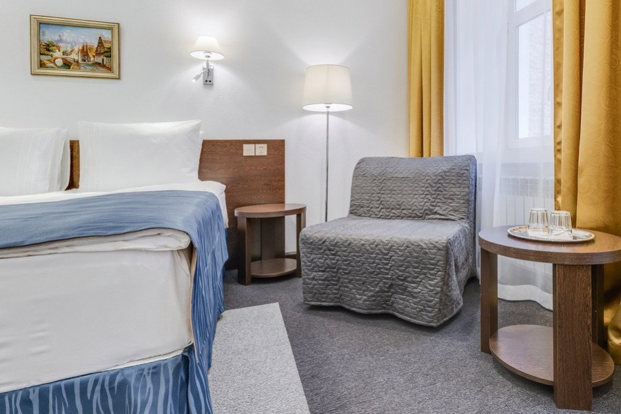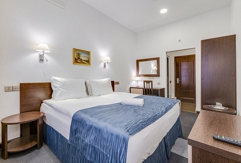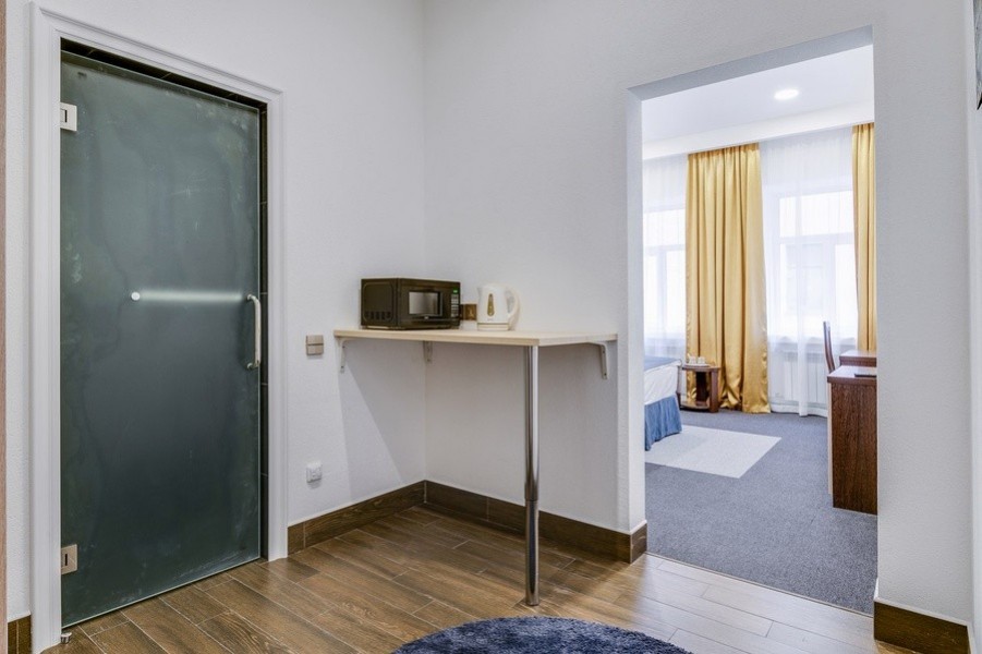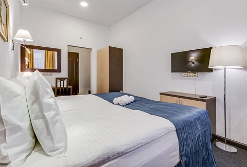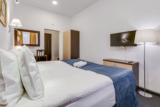 В номере: вешалка, зеркало, кресло-кровать, кровать двуспальная, прикроватные тумбочки, стол, стулья, шкаф, микроволновая печь, мини-холодильник, сейф, телевизор, утюг, чайный набор посуды, электрочайник