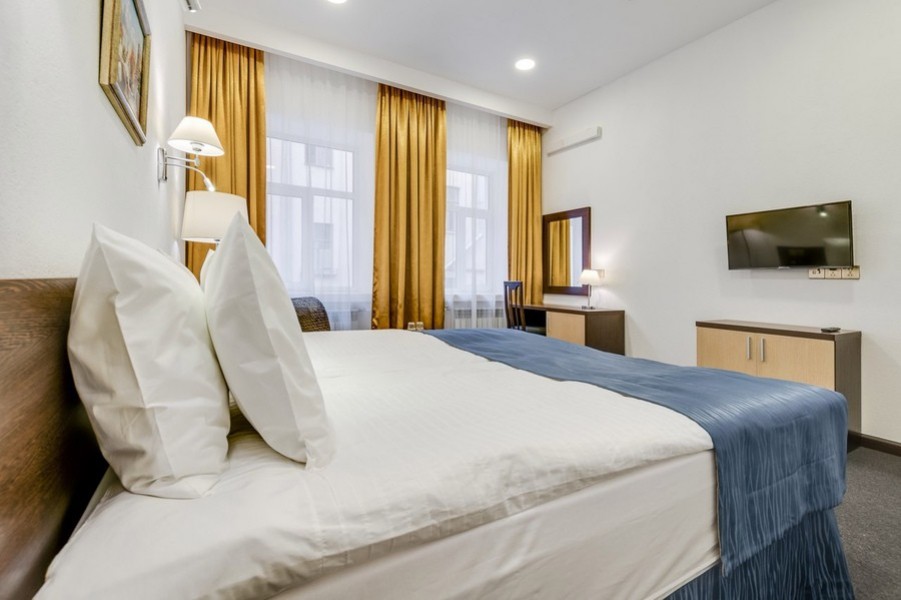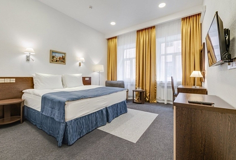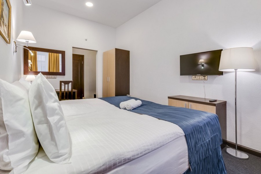 В номере: вешалка, зеркало, кровати односпальные /одна двуспальная кровать, стол, стулья, шкаф, мини-холодильник, сейф, телевизор, утюг