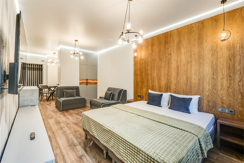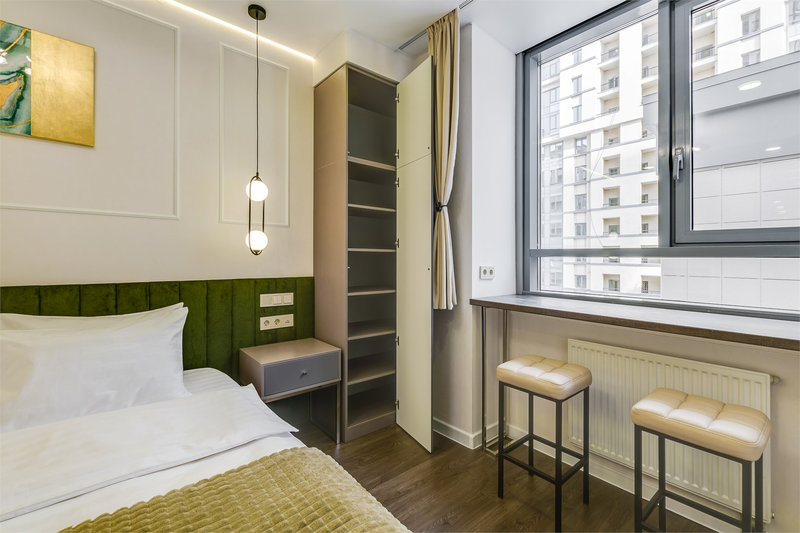 В номере: вешалка, зеркало, кресло-кровать, кровати односпальные /одна двуспальная кровать, прикроватные тумбочки, стол, стул, шкаф, микроволновая печь, мини-холодильник, набор посуды, плита, телевизор, чайник