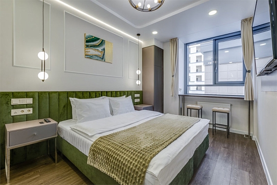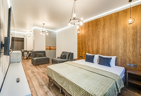В номере: вешалка, зеркало, кровать двуспальная, прикроватные тумбочки, стол, стул, шкаф, микроволновая печь, мини-холодильник, набор посуды, плита, телевизор, чайник