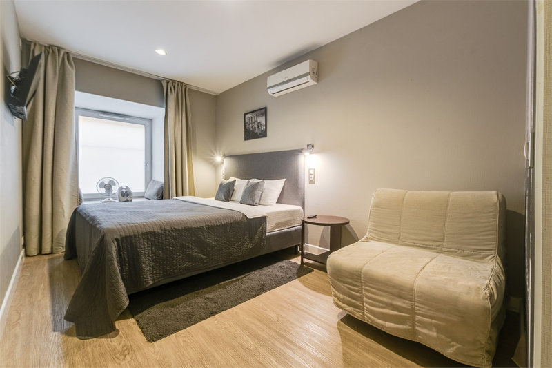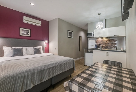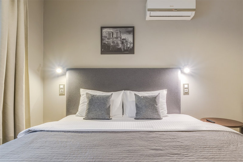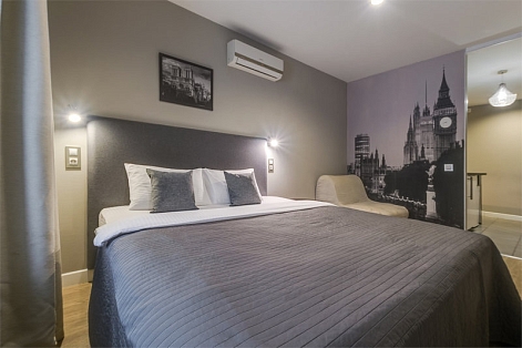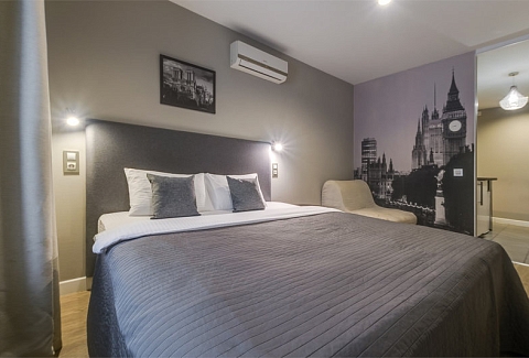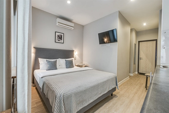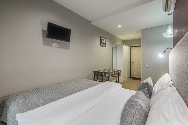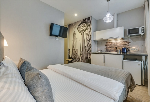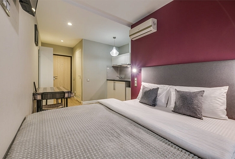 В номере: вешалка, зеркало, кресло-кровать, кровать двуспальная, стол, стул, кондиционер, микроволновая печь, мини-холодильник, набор посуды, телевизор, чайник