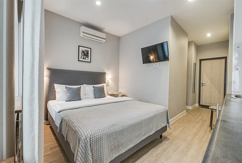 В номере: вешалка, зеркало, кровать двуспальная, стол, стул, кондиционер, микроволновая печь, мини-холодильник, набор посуды, телевизор, чайник