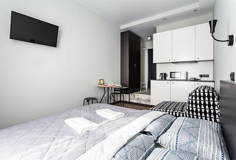 В номере: вешалка, зеркало, кресло-кровать, кровать двуспальная, стол, стулья, микроволновая печь, мини-холодильник, набор посуды, телевизор, чайник