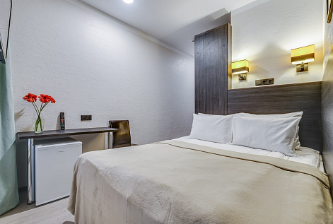 В номере: кровать двуспальная, прикроватные столики, стол, стулья, шкаф, мини-холодильник, телевизор, утюг, электрочайник