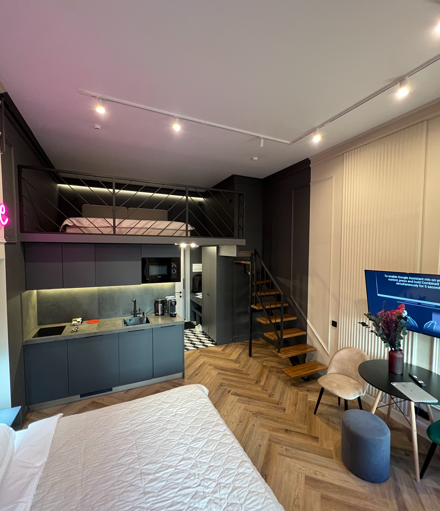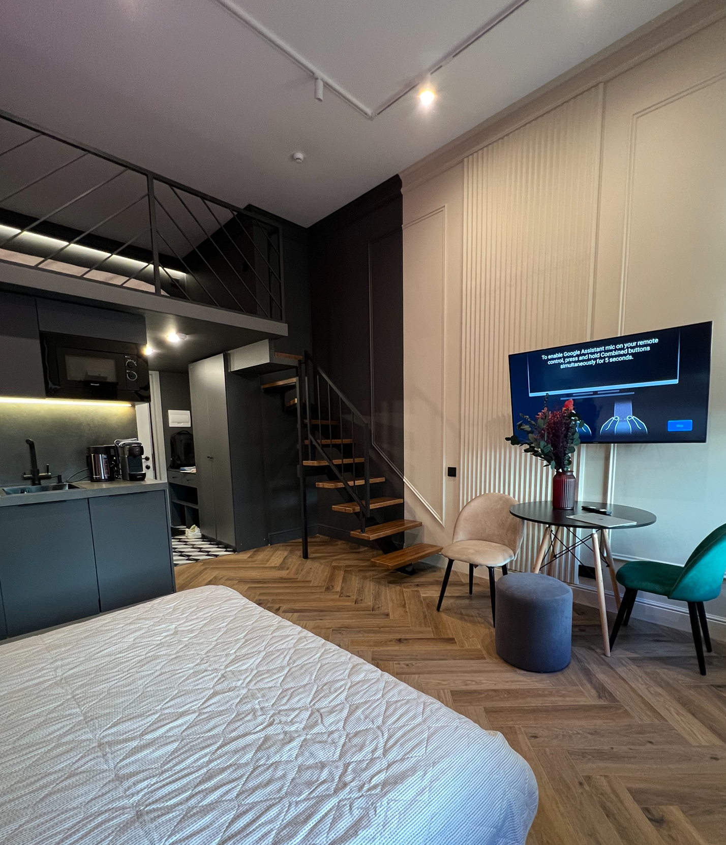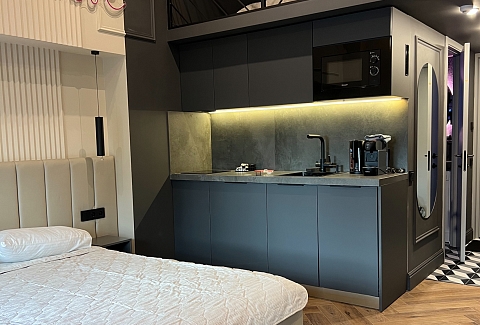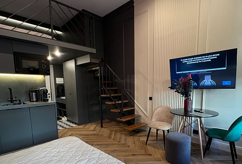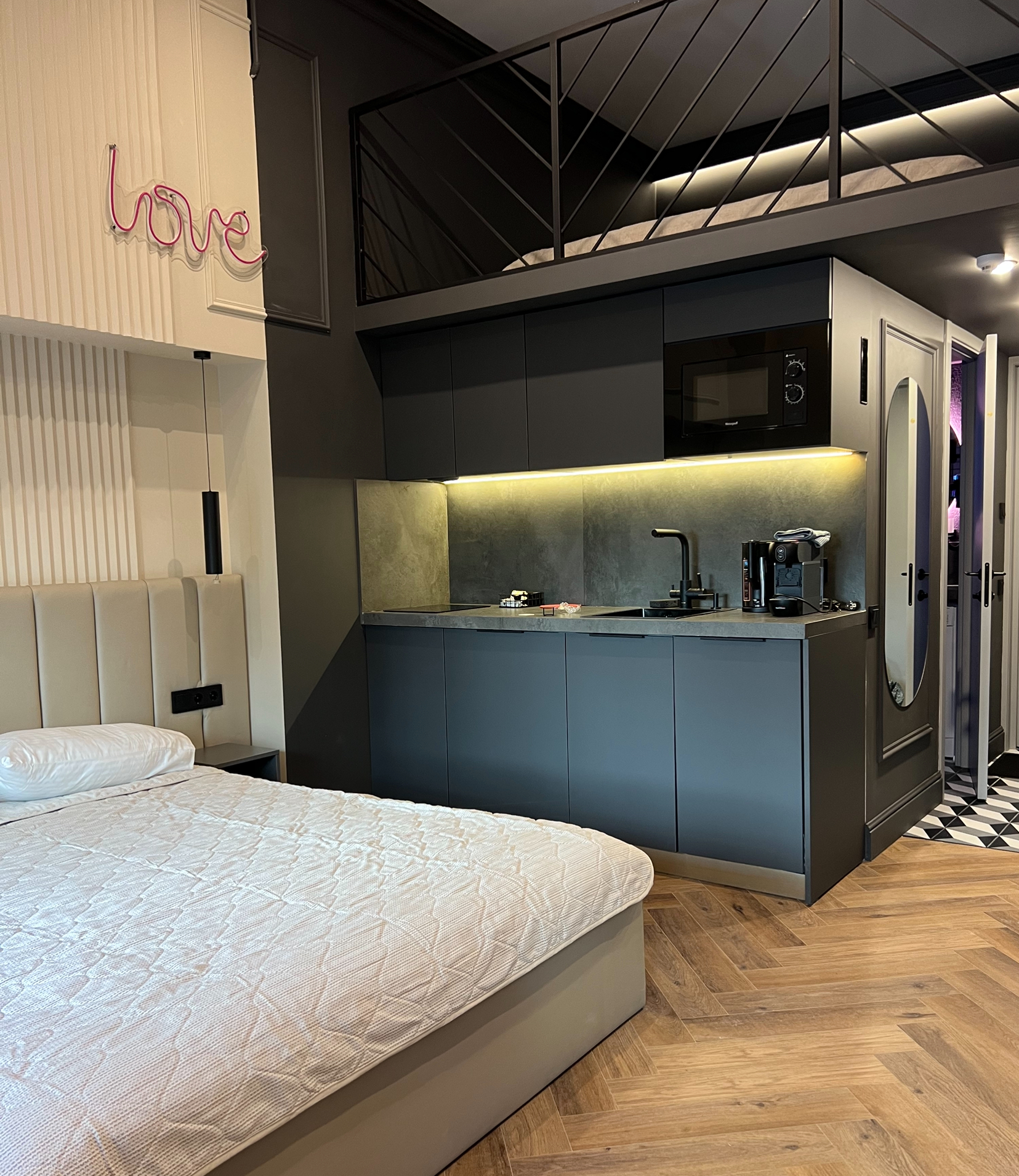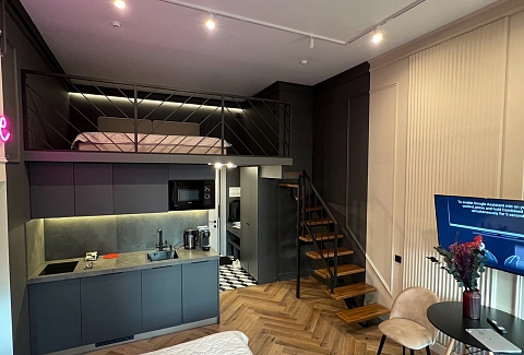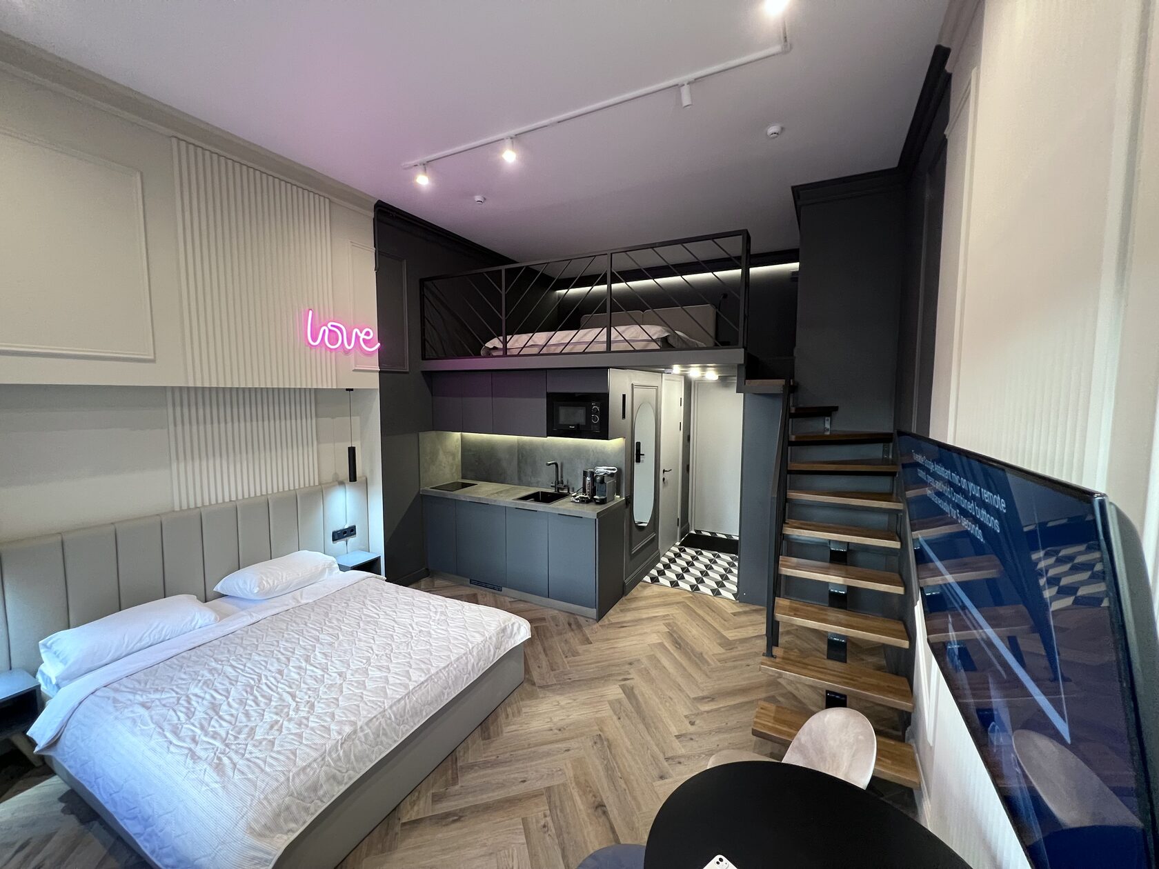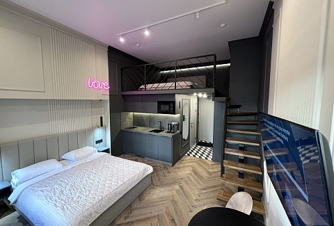 Рядом с апартаментами расположена остановка общественного транспорта, что обеспечивает удобство перемещения по городу.Гостей ожидает полный спектр удобств: кондиционер и современная система вентиляции, Smart TV и высокоскоростной Wi-Fi. Предусмотрено удаленное заселение, а безопасность обеспечивается видеонаблюдением и охраной. Высококачественная шумоизоляция и теплый пол создают уютную атмосферу.Для комфорта имеется: просторная двуспальная кровать King Size (высота потолка второго уровня 150см) с эргономичным матрасом средней жесткости и комплектом свежего белья для каждого гостя. Есть гардероб и гладильные принадлежности. В апартаментах полностью оборудованная кухня с кофемашиной. В оборудованном санузле: теплый пол с душевой кабиной, стиральная машина и косметические принадлежности.
