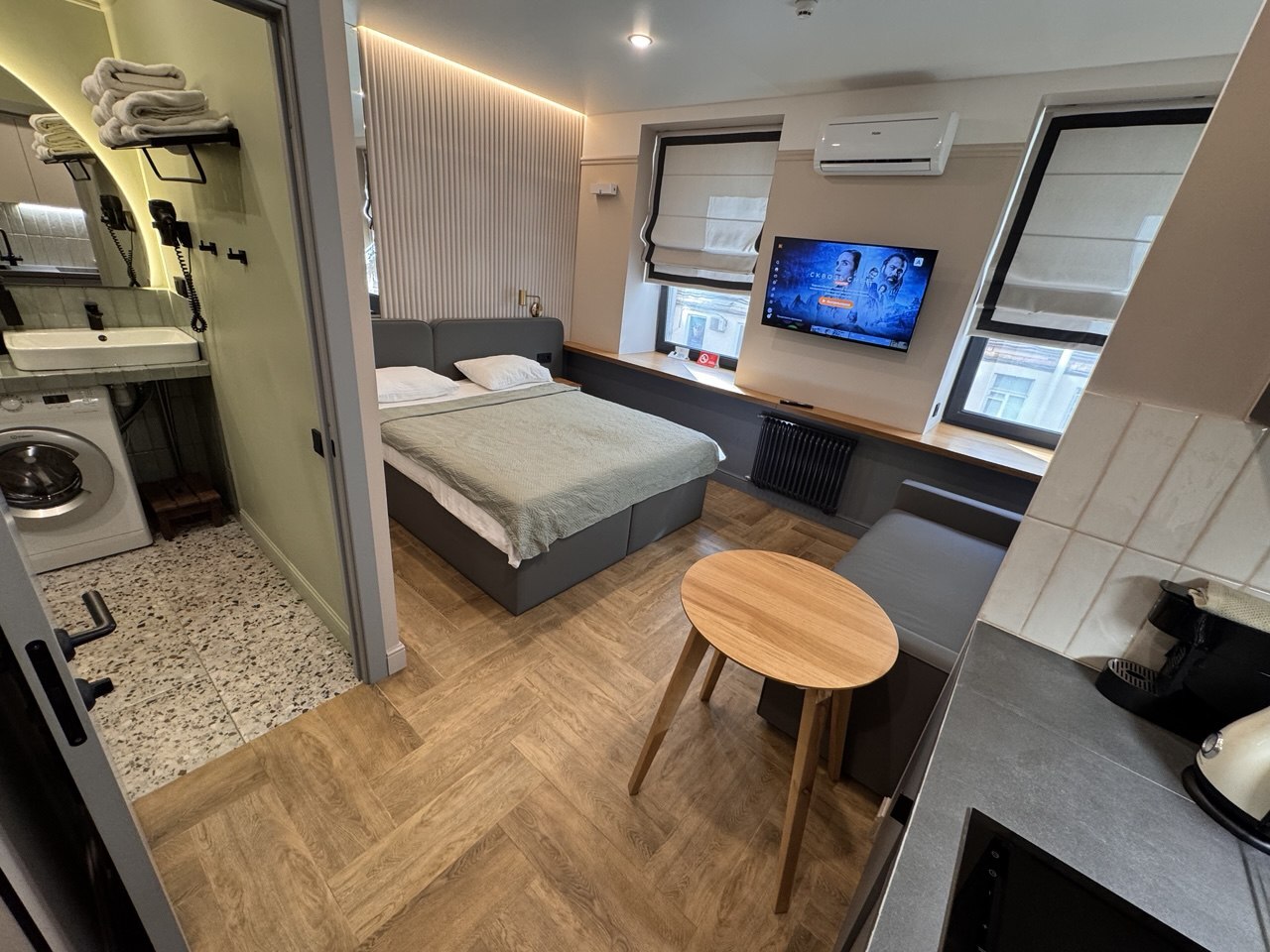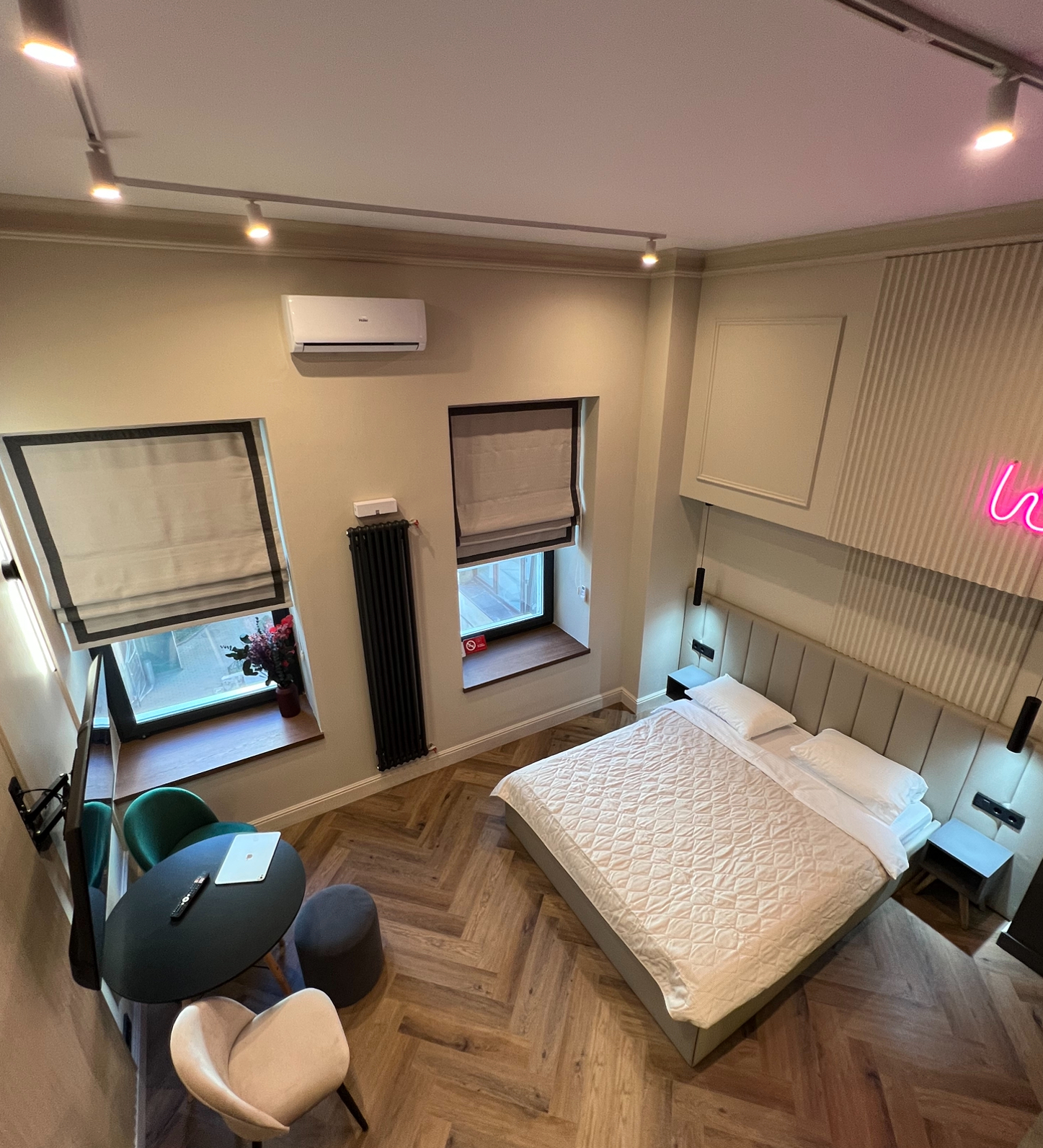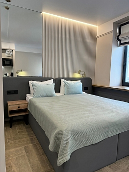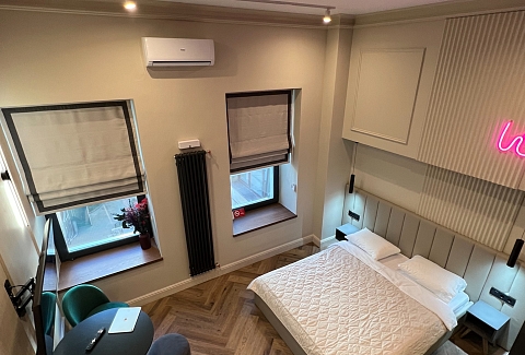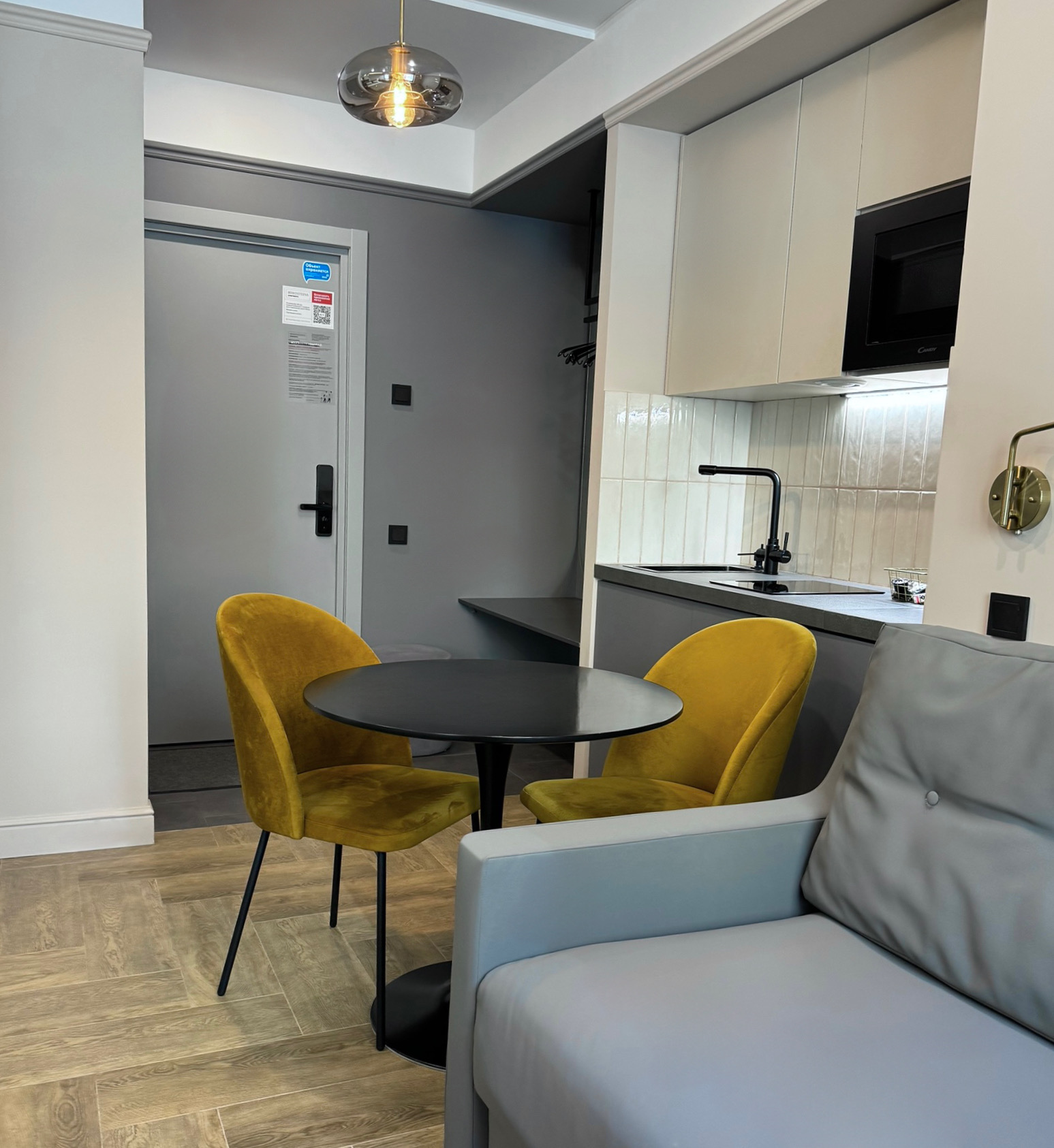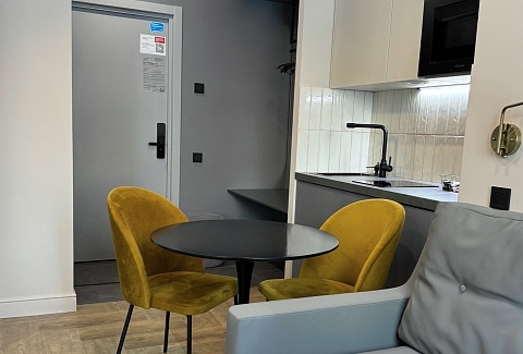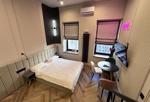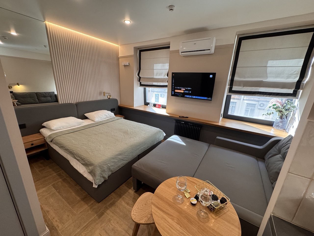 Рядом с апартаментами расположена остановка общественного транспорта, что обеспечивает удобство перемещения по городу.Гостей ожидает полный спектр удобств: кондиционер и современная система вентиляции, Smart TV и высокоскоростной Wi-Fi. Предусмотрено удаленное заселение, а безопасность обеспечивается видеонаблюдением и охраной. Высококачественная шумоизоляция и теплый пол создают уютную атмосферу.Для комфорта имеется: просторная двуспальная кровать King Size (высота потолка второго уровня 150см) с эргономичным матрасом средней жесткости и комплектом свежего белья для каждого гостя. Есть гардероб и гладильные принадлежности. В апартаментах полностью оборудованная кухня с кофемашиной. В оборудованном санузле: теплый пол с душевой кабиной, стиральная машина и косметические принадлежности.