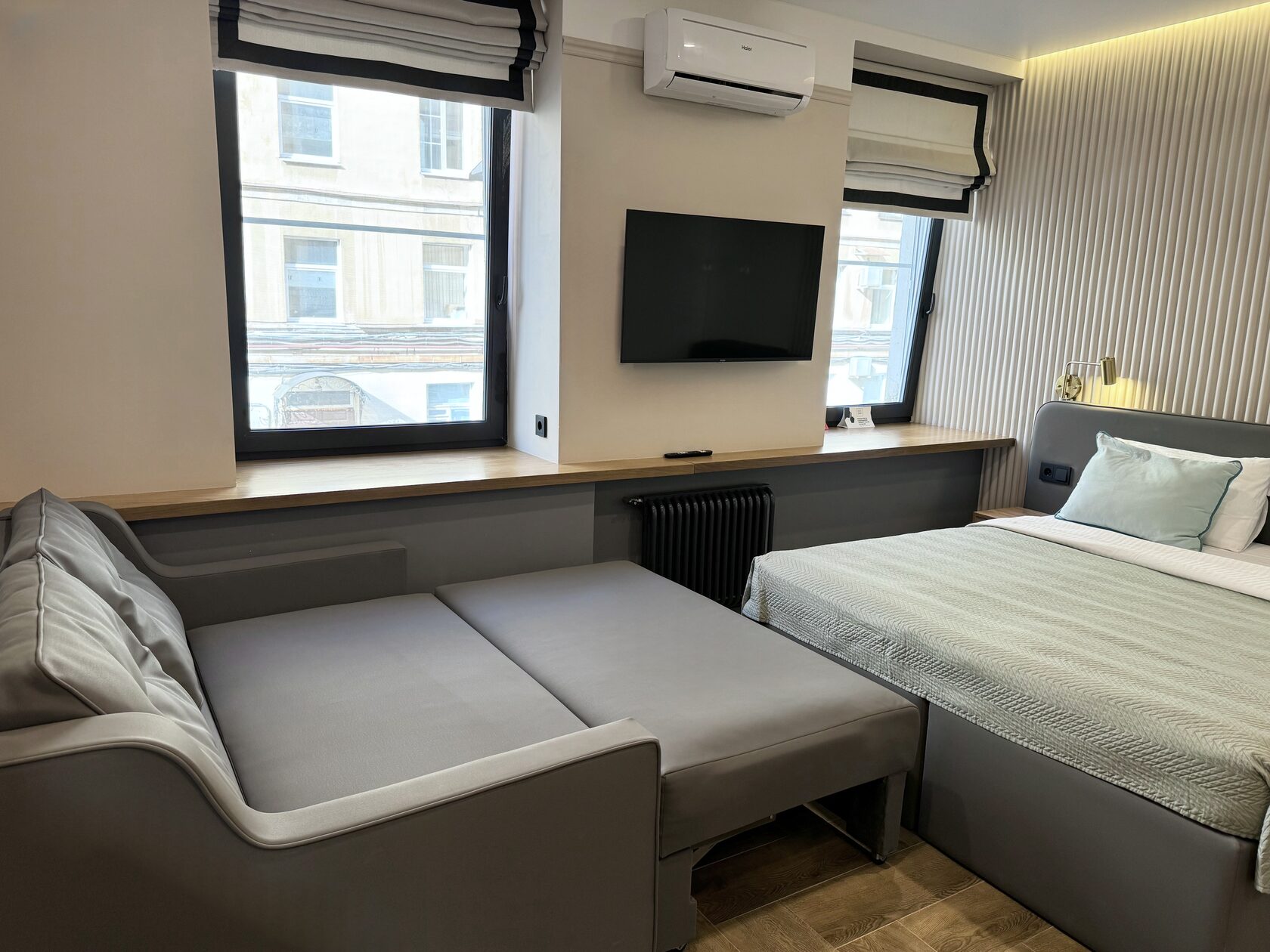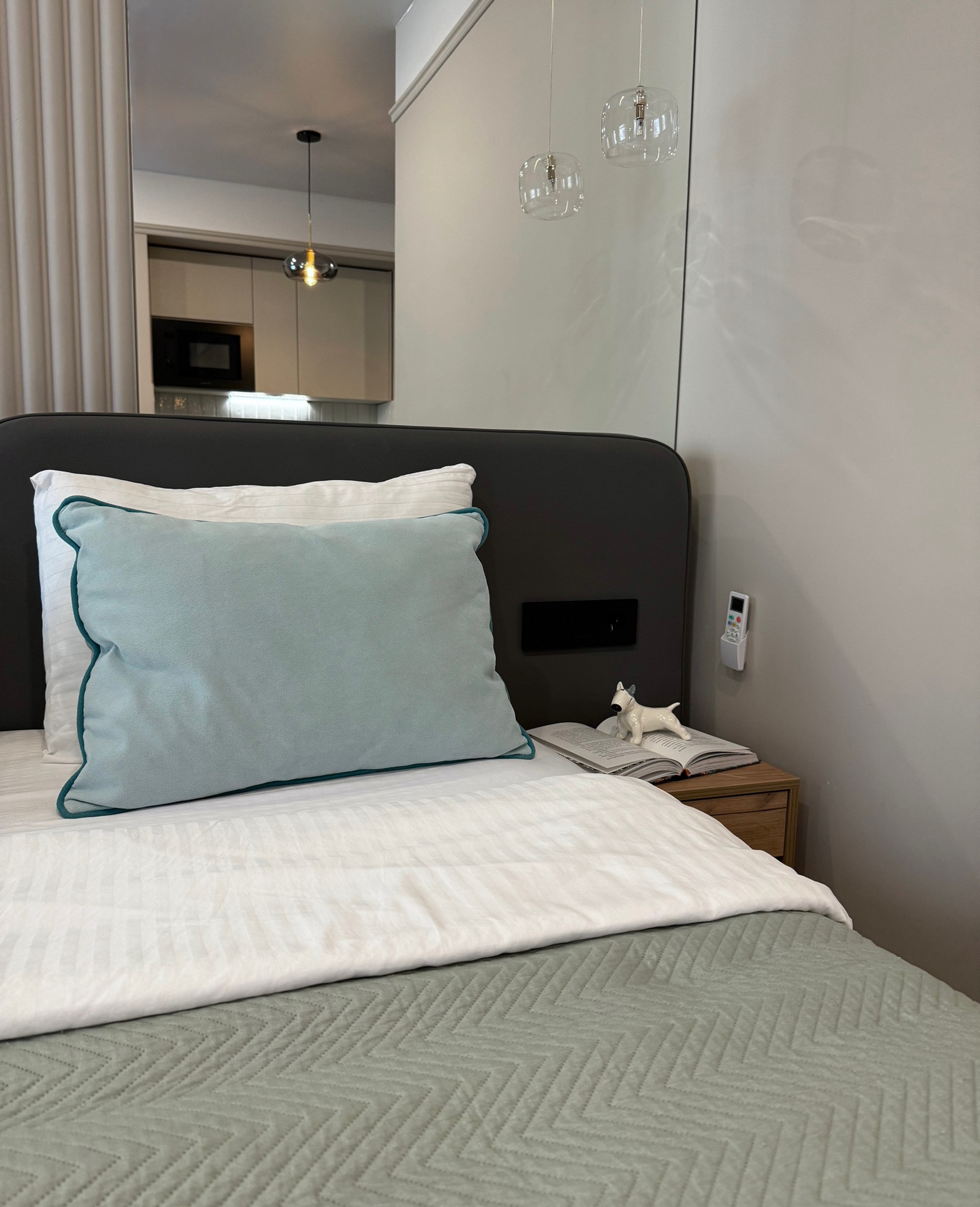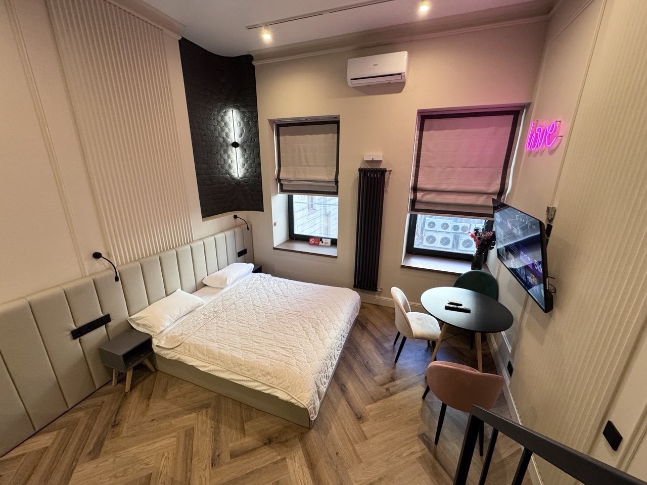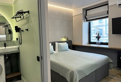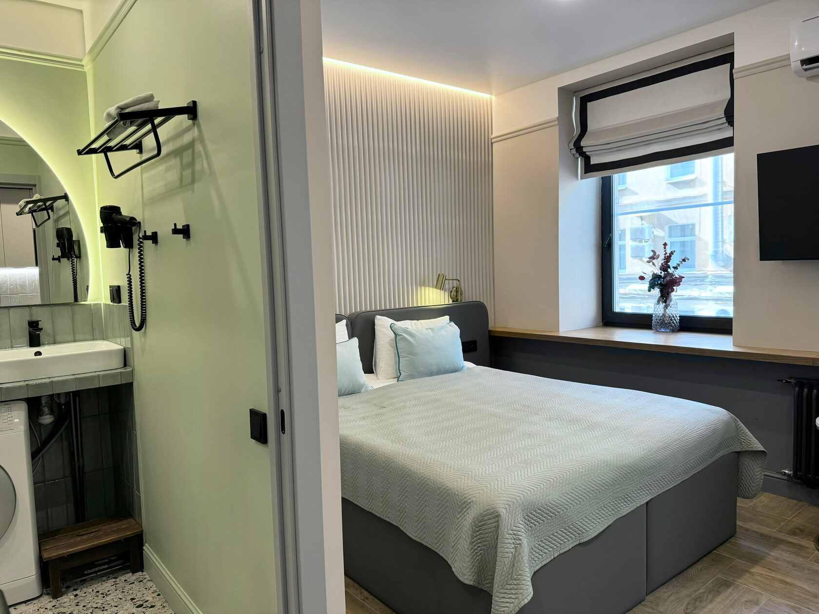 Рядом с апартаментами расположена остановка общественного транспорта, что обеспечивает удобство перемещения по городу.Гостей ожидает полный спектр удобств: кондиционер и современная система вентиляции, Smart TV и высокоскоростной Wi-Fi. Предусмотрено удаленное заселение, а безопасность обеспечивается видеонаблюдением и охраной. Высококачественная шумоизоляция и теплый пол создают уютную атмосферу.Для комфорта имеется: просторная двуспальная кровать King Size (высота потолка второго уровня 150см) с эргономичным матрасом средней жесткости и комплектом свежего белья для каждого гостя. Есть гардероб и гладильные принадлежности. В апартаментах полностью оборудованная кухня с кофемашиной. В оборудованном санузле: теплый пол с душевой кабиной, стиральная машина и косметические принадлежности.