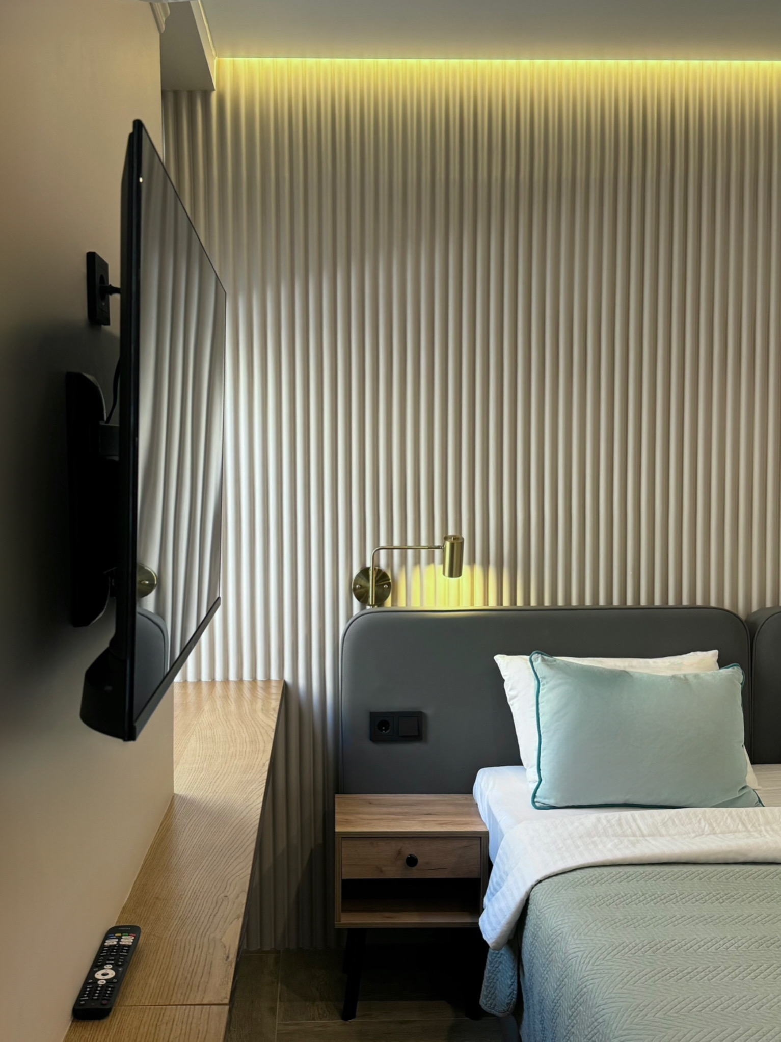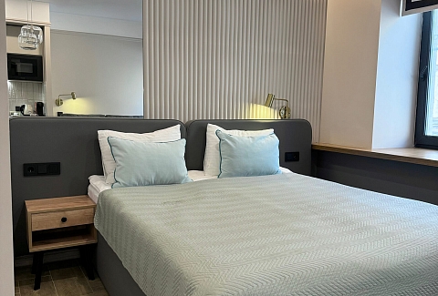 В номере: кровать двуспальная, прикроватные тумбочки, стол обеденный, стулья, кондиционер, кофемашина, микроволновая печь, мини-холодильник, плита, стиральная машина, телевизор