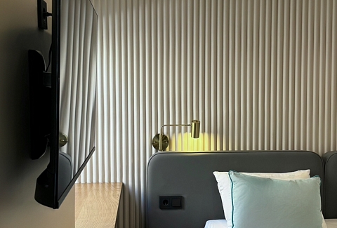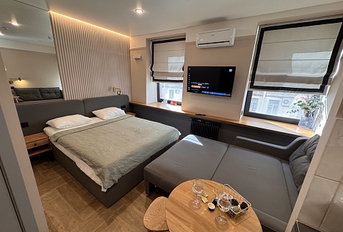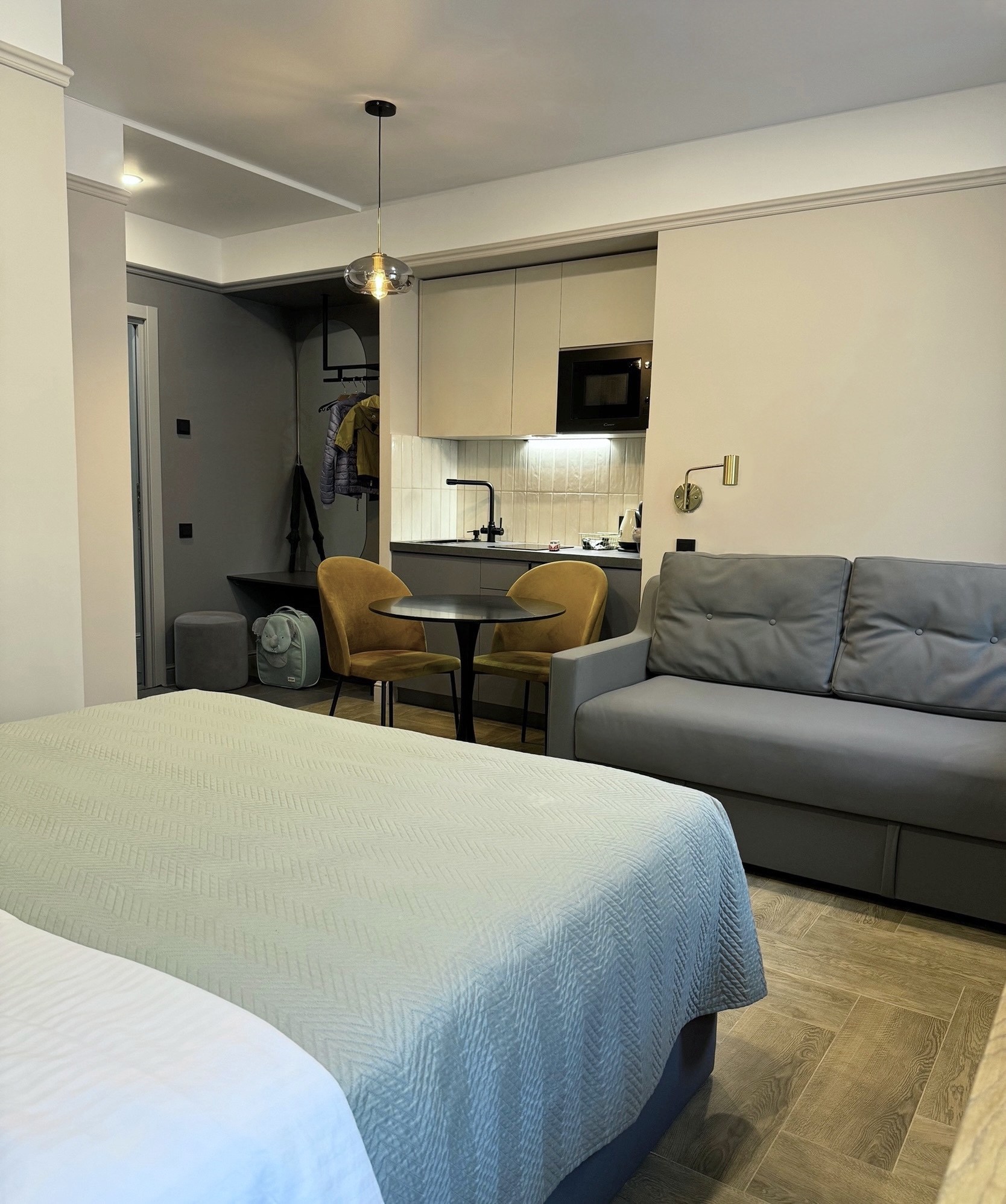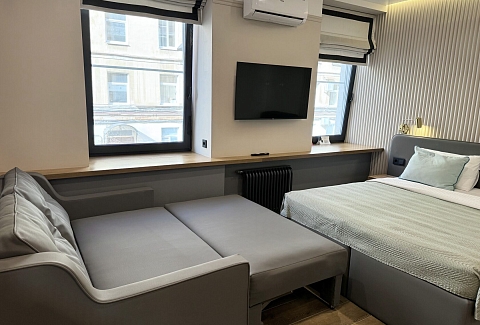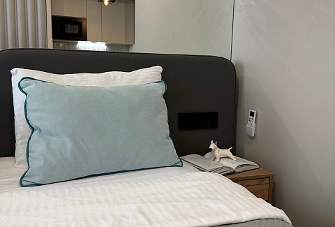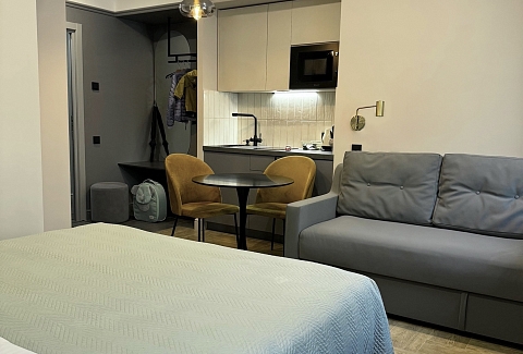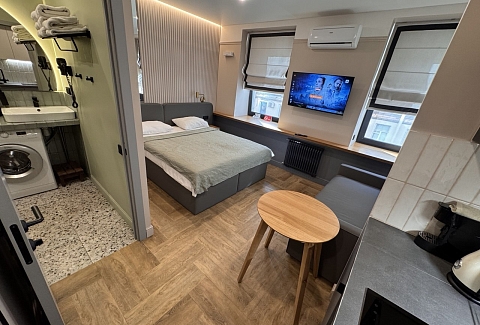 В номере: диван раскладной, кровать двуспальная, прикроватные тумбочки, стол обеденный, стулья, кондиционер, кофемашина, микроволновая печь, мини-холодильник, плита, стиральная машина, телевизор, электрочайник