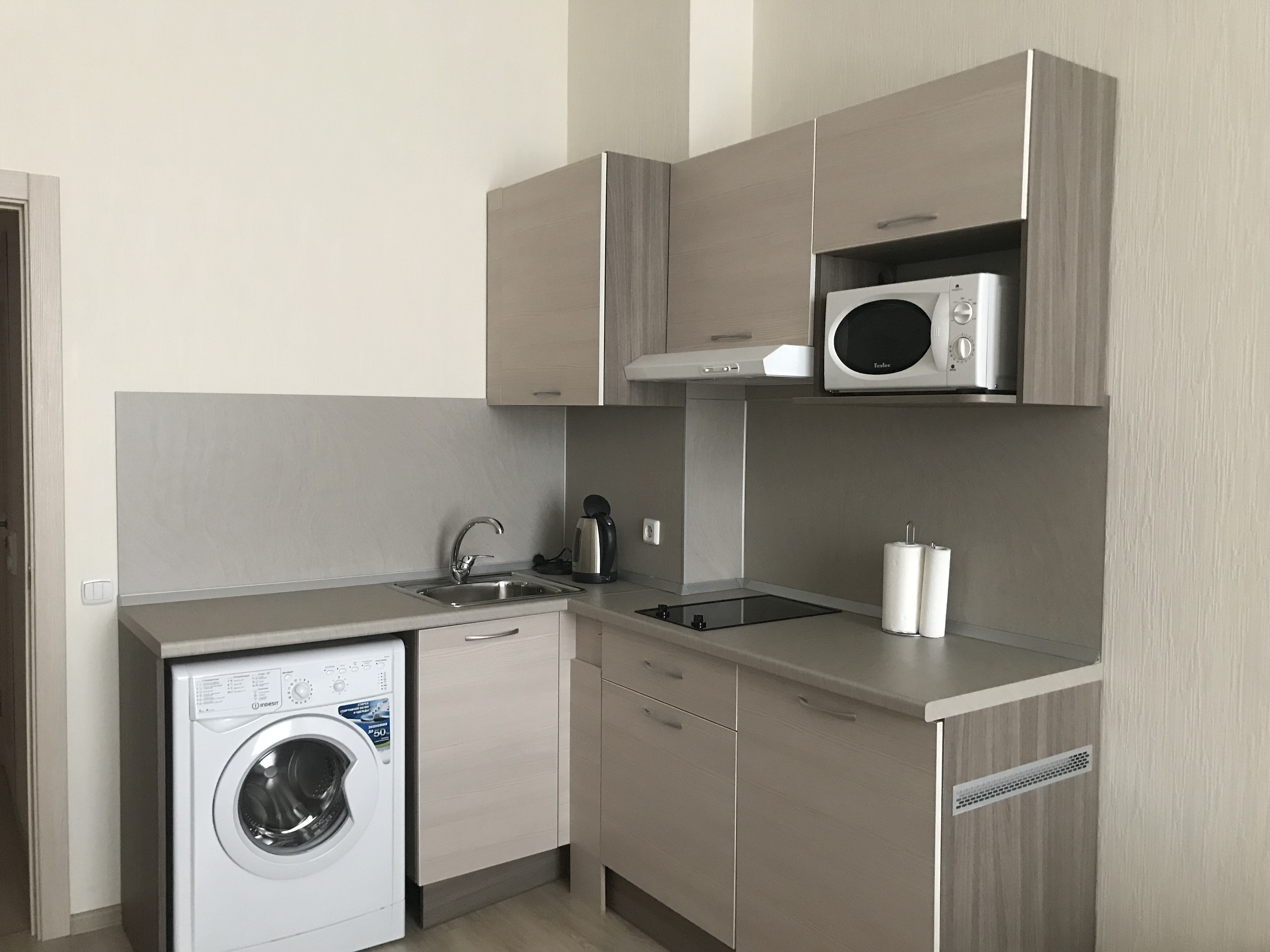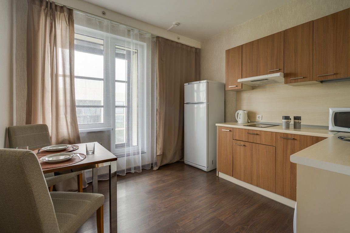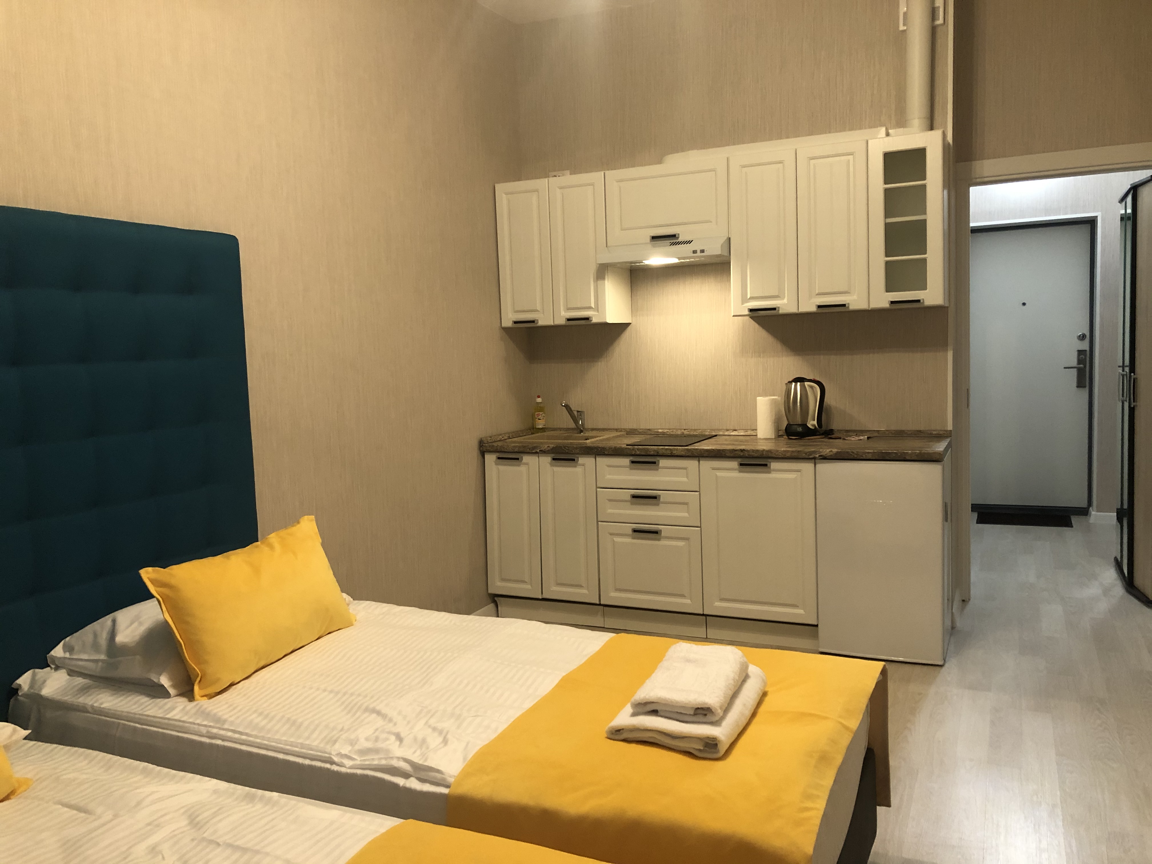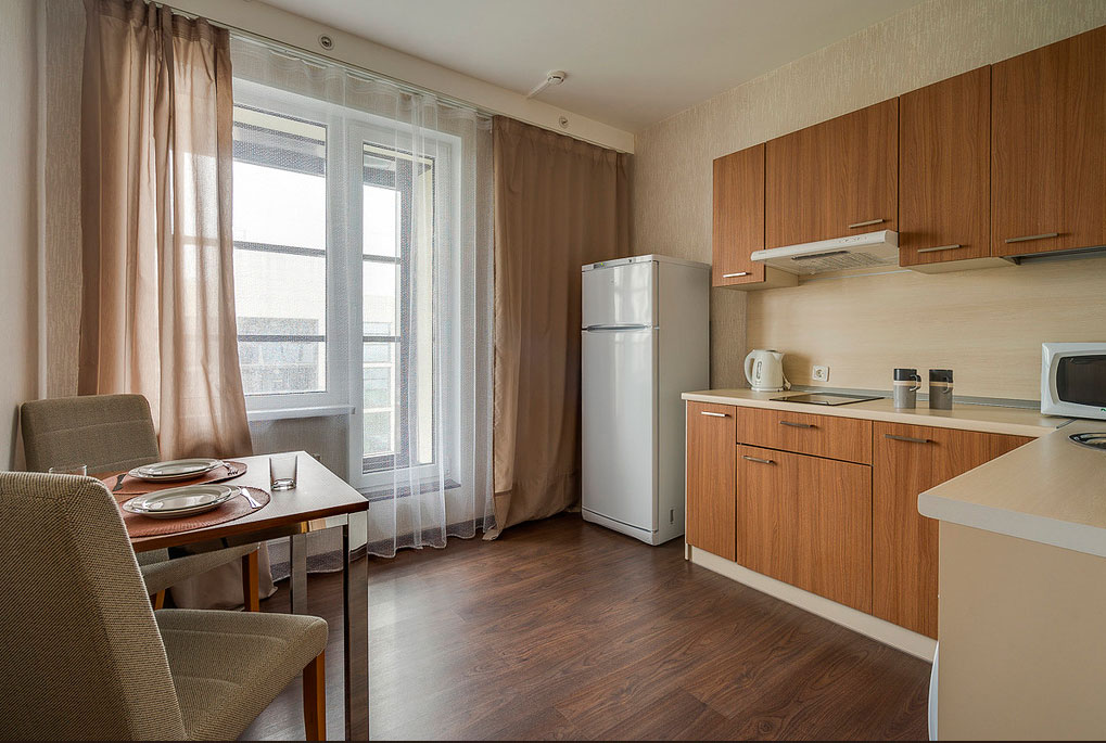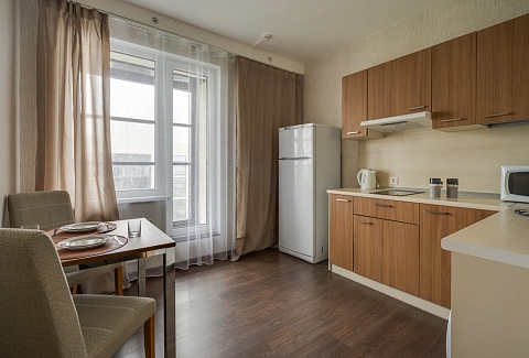 В номере: вешалка, зеркало, кровати односпальные, прикроватные тумбочки, стол, стулья, шкаф, гладильная доска, микроволновая печь, набор посуды, плита электрическая, стиральная машина, телевизор, утюг, холодильник, электрочайник